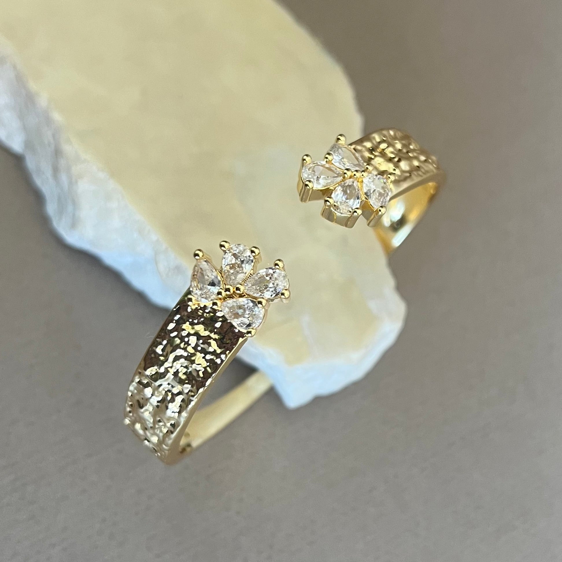 Duke is a sleek gold plated bangle that catches the light with a hammered surface and a smooth, polished interior. Each open end is crowned with clear, pear-cut crystals in petite clusters, giving a refined shine that feels quietly special.