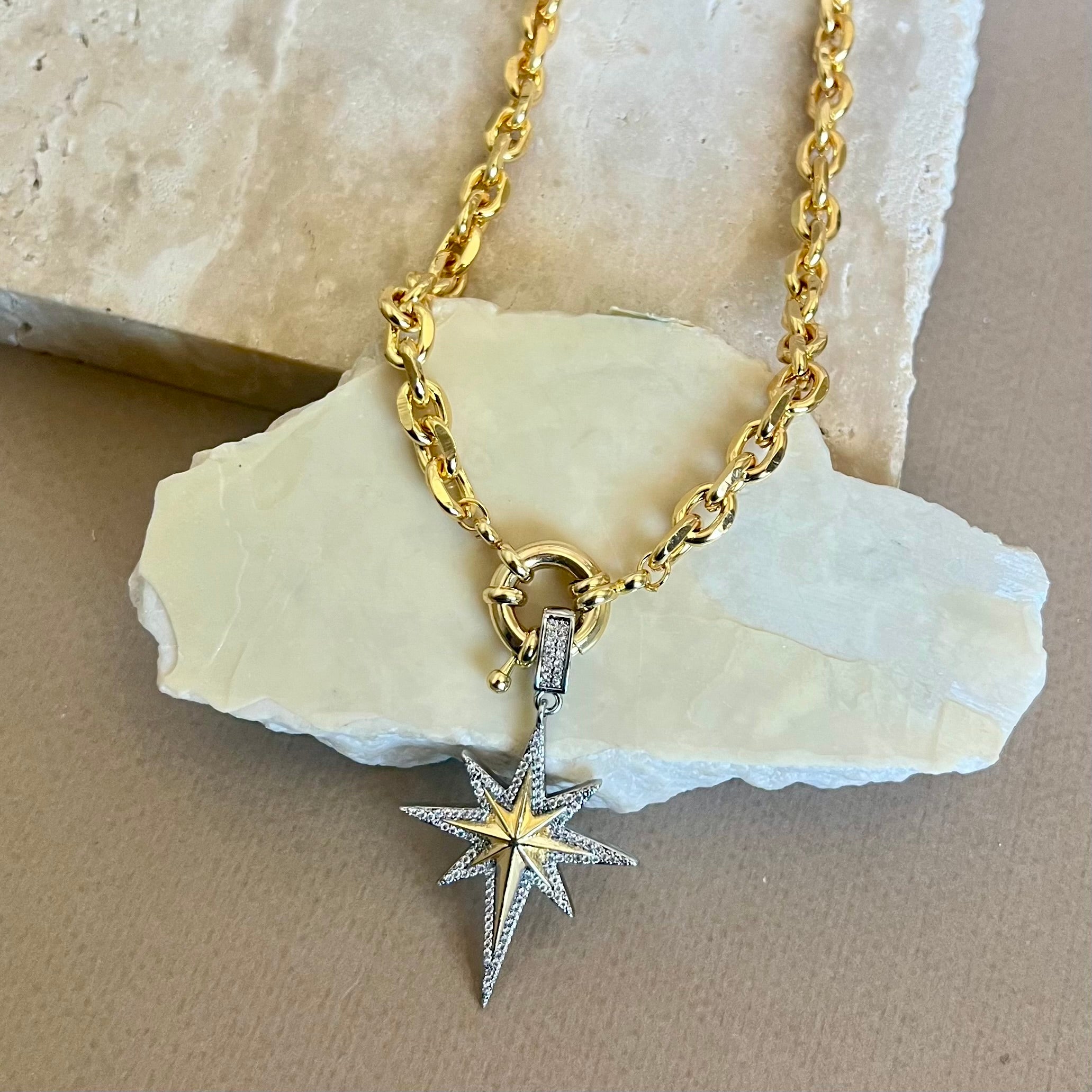 Estrella 10 brings a bright focal point to your look. A high-polish, gold-plated chunky oval-link chain meets a front ring clasp that also acts as a sleek accent. From it hangs a two-tone North Star pendant: a warm gold inner star framed by a silver-tone outer star with pavé crystals that catch every flicker of light.