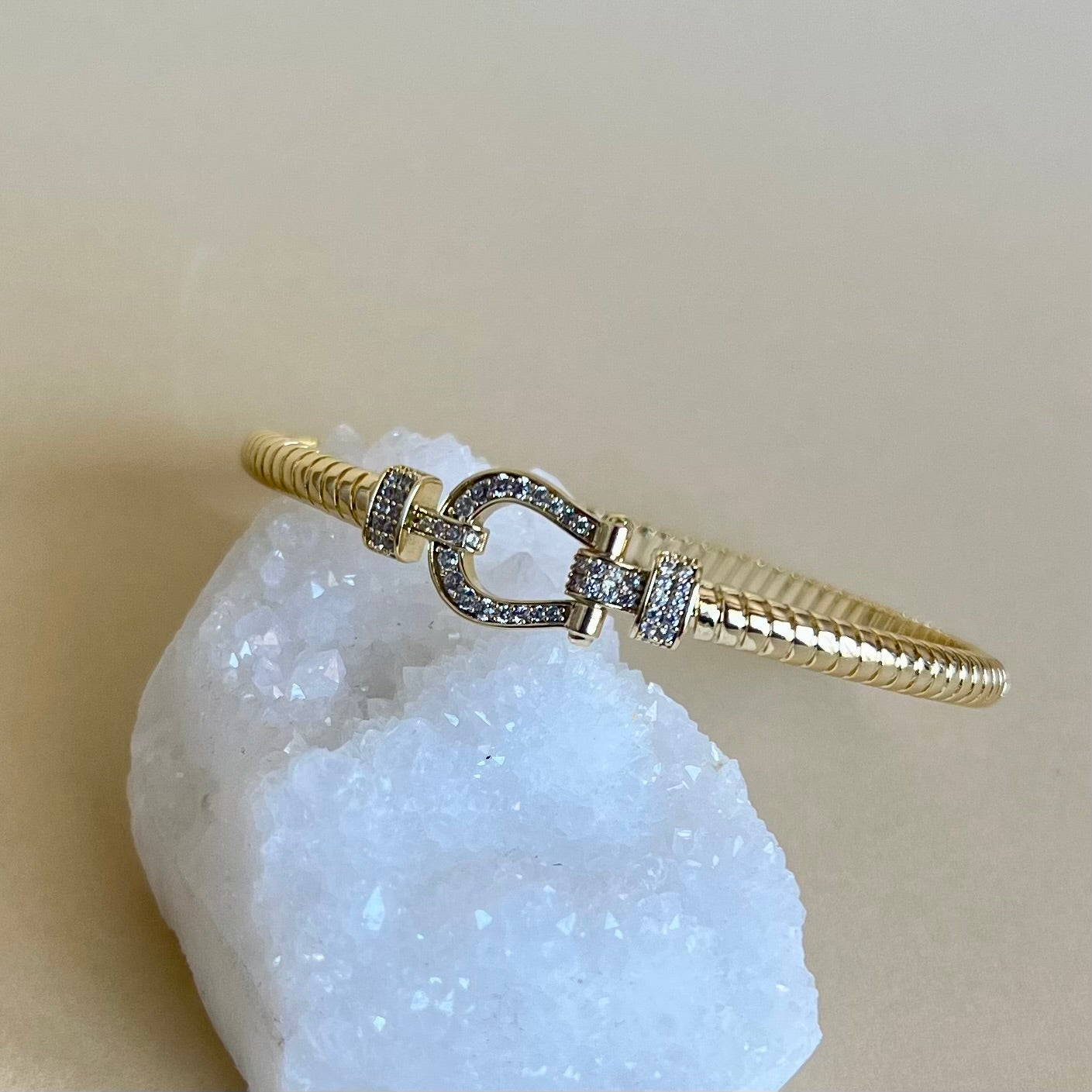 Its semi-rigid feel keeps the profile clean, whether worn solo or stacked with a watch. Polished, modern, and a touch equestrian, it brings easy glamour to weekdays and evenings alike. Make it your signature piece and let it shine with your style. Add the Finch 02 gold plated bangle to your collection today.