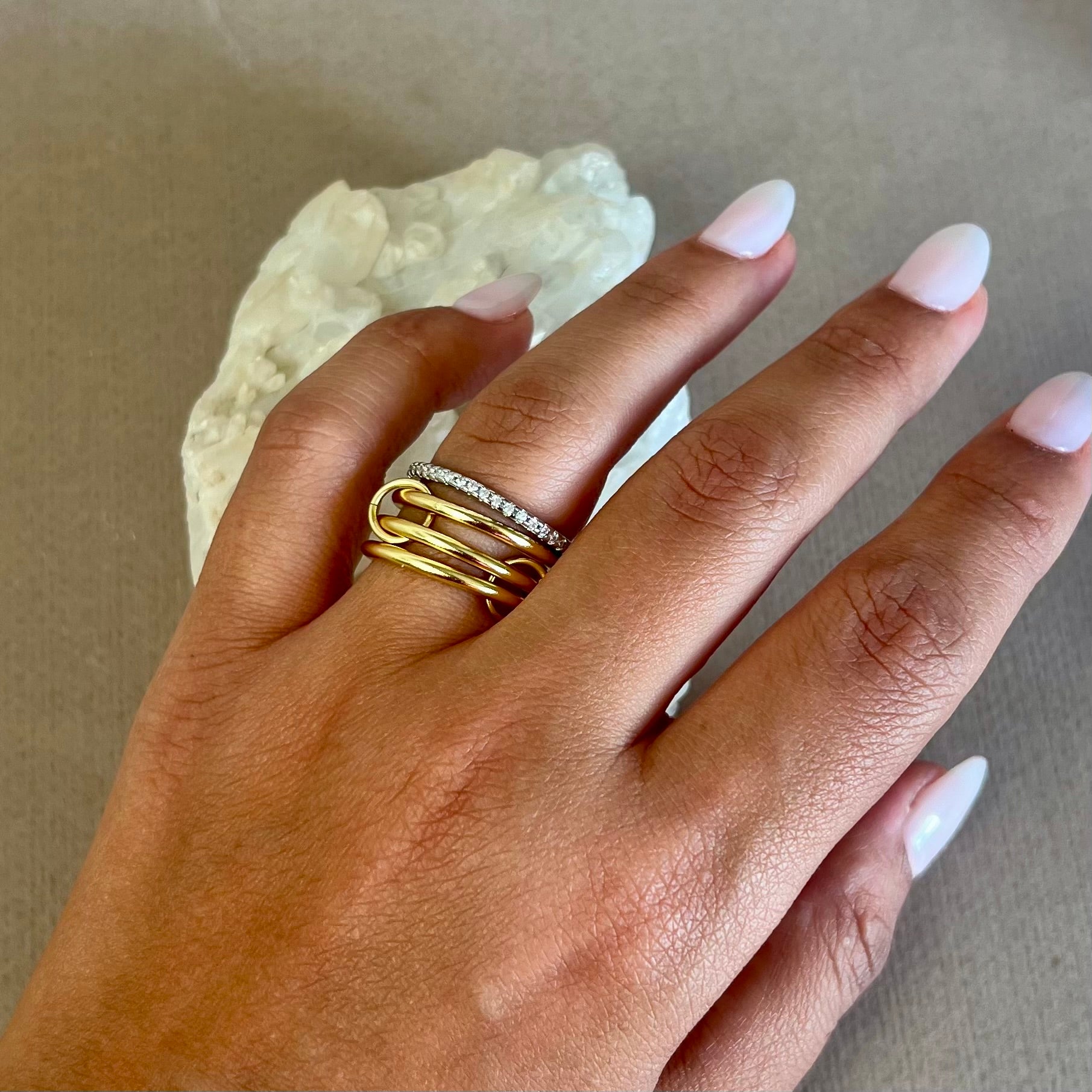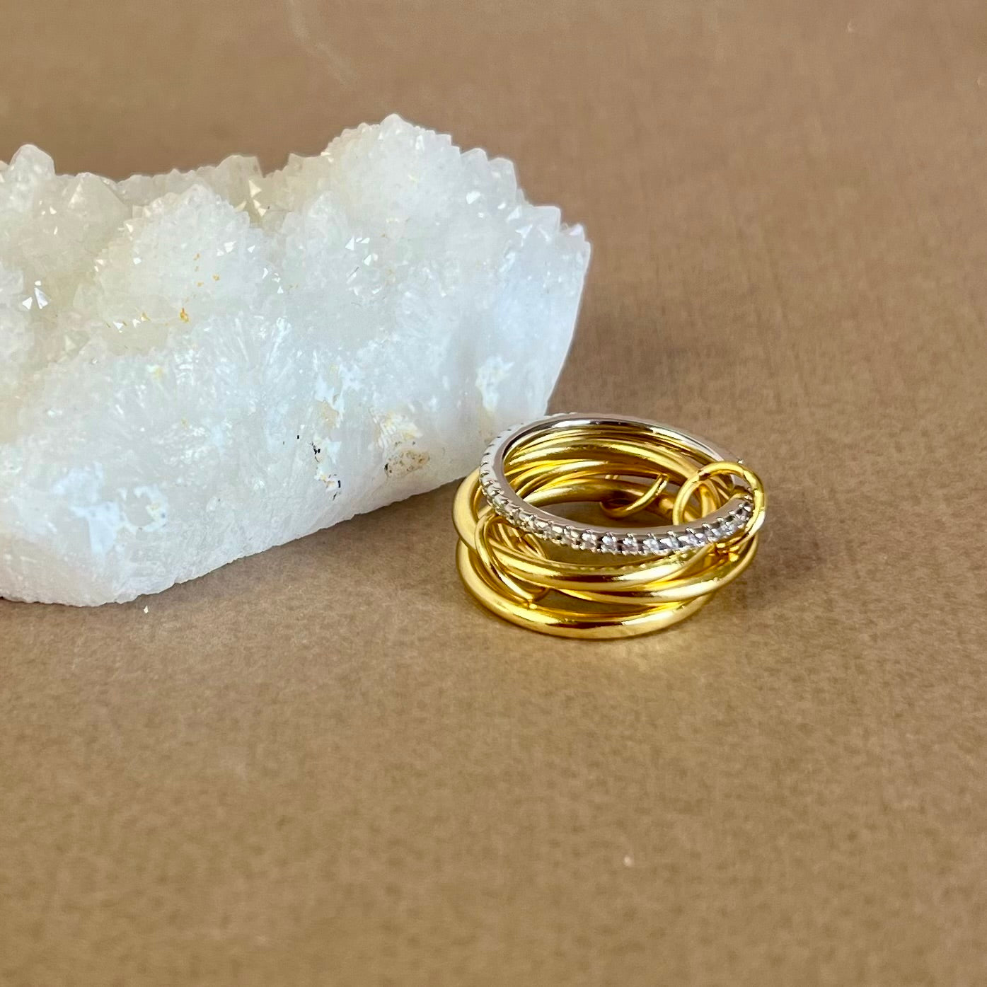 Mirex brings the stacked look to one elegant piece. This stainless steel ring features four interlocking bands that glide together. Three bands glow in high-polish gold tone, and a silver-tone band sparkles with pavé clear stones. Its rounded profile feels refined and comfortable from day to night.
