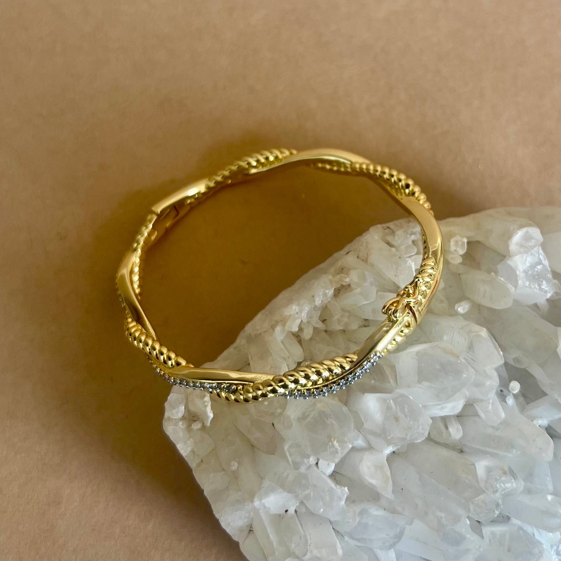 Bianca brings a soft shimmer to your everyday. This gold plated bangle pairs a rope-textured gold strand with a slim pavé line of clear stones, gently crossing in a fluid twist. The polished finish and slender oval profile catch light with every move, giving a refined mix of glow and sparkle.