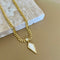 Dama brings quiet glamour to every day. This gold plated necklace pairs a high-shine curb chain with a slim kite pendant set with a luminous white inlay and a delicate beaded frame. A bezel-set crystal links chain and pendant, adding a soft flash as you move. The look is clean, feminine, and made to draw the eye without trying.