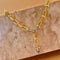 Polina 04 is a gold plated necklace with a graceful Y lariat shape. Oversized paperclip links, dotted with tiny polished spheres, lead to pavé connectors and a smooth center ring. A single elongated link ends in a pavé U charm, catching the light with a soft, confident sparkle. High polish plating and subtle stones create a balanced, modern look.