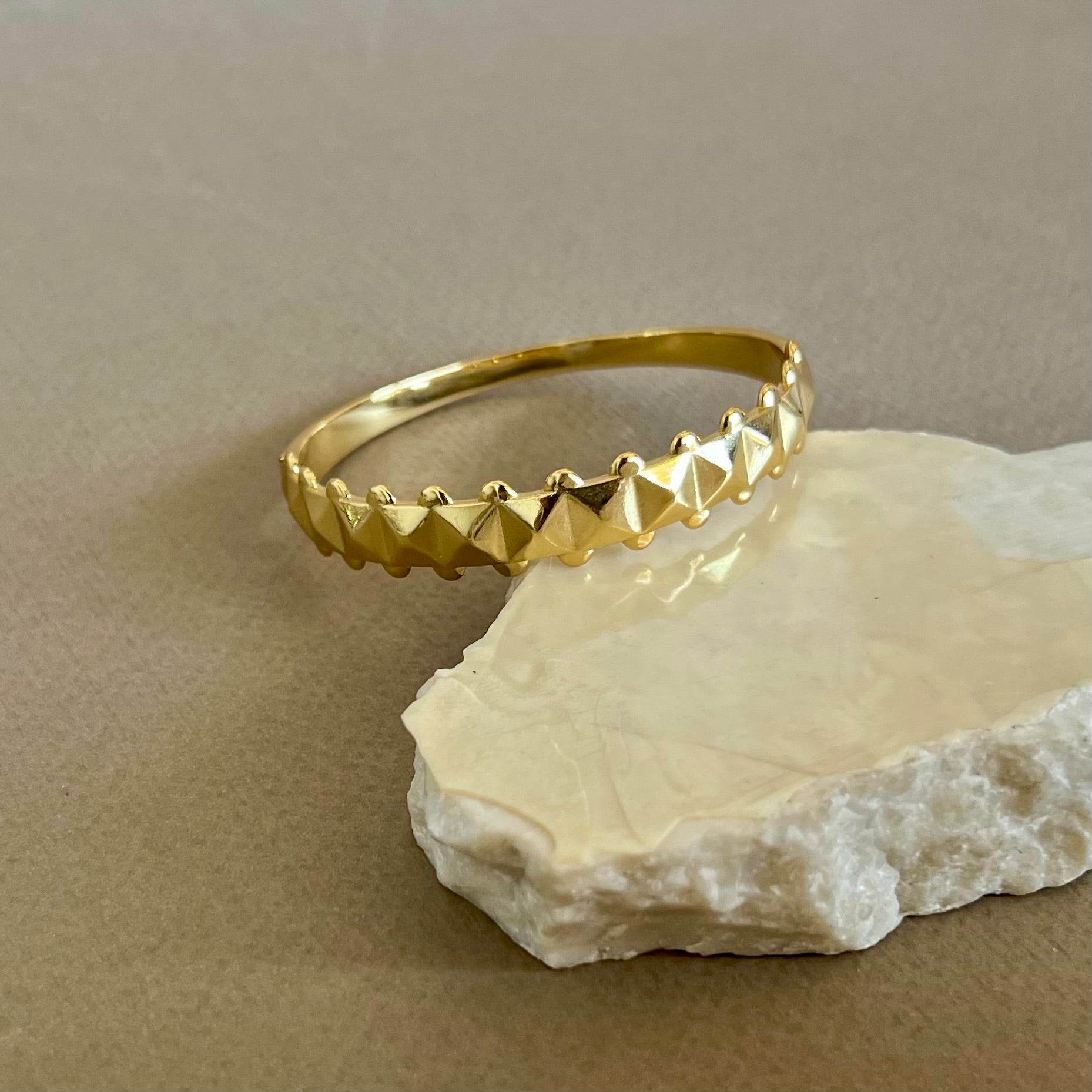 Cassandra 03 is a sculptural gold plated bangle with a refined edge. A continuous row of pyramid studs, framed by delicate beaded accents, gives the piece a confident, modern character. The high polish brings a clear, mirror glow that feels luxurious without trying. Thoughtfully finished, it brings a refined touch to every look.