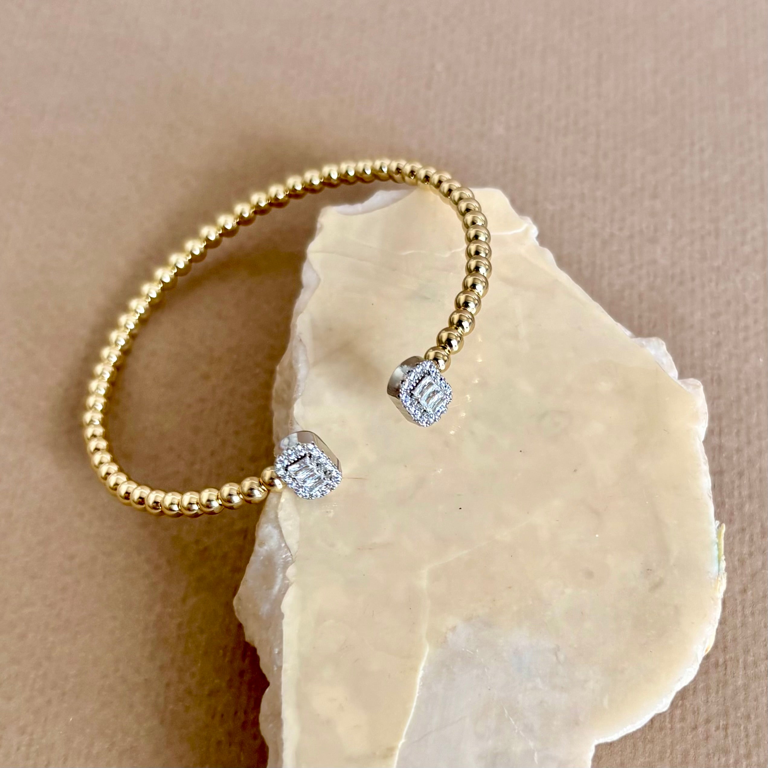 Sinal 06 | Gold Plated Bangle brings refined ease to every moment. A sleek open cuff crafted from a continuous strand of polished gold-tone beads, it finishes with rectangular, emerald-cut crystal end caps framed by delicate pavé. The subtle two-tone detail feels fresh and quietly radiant.