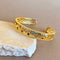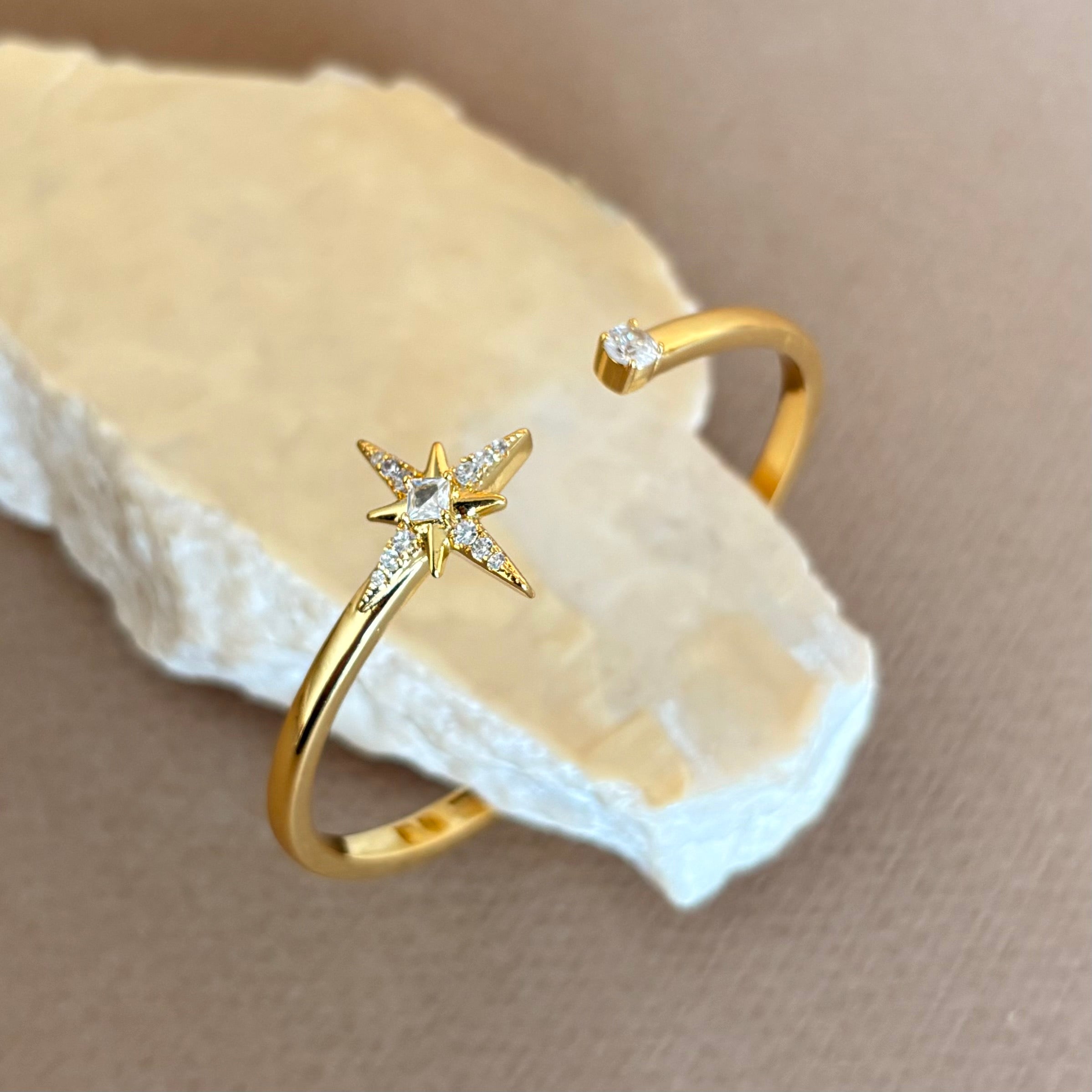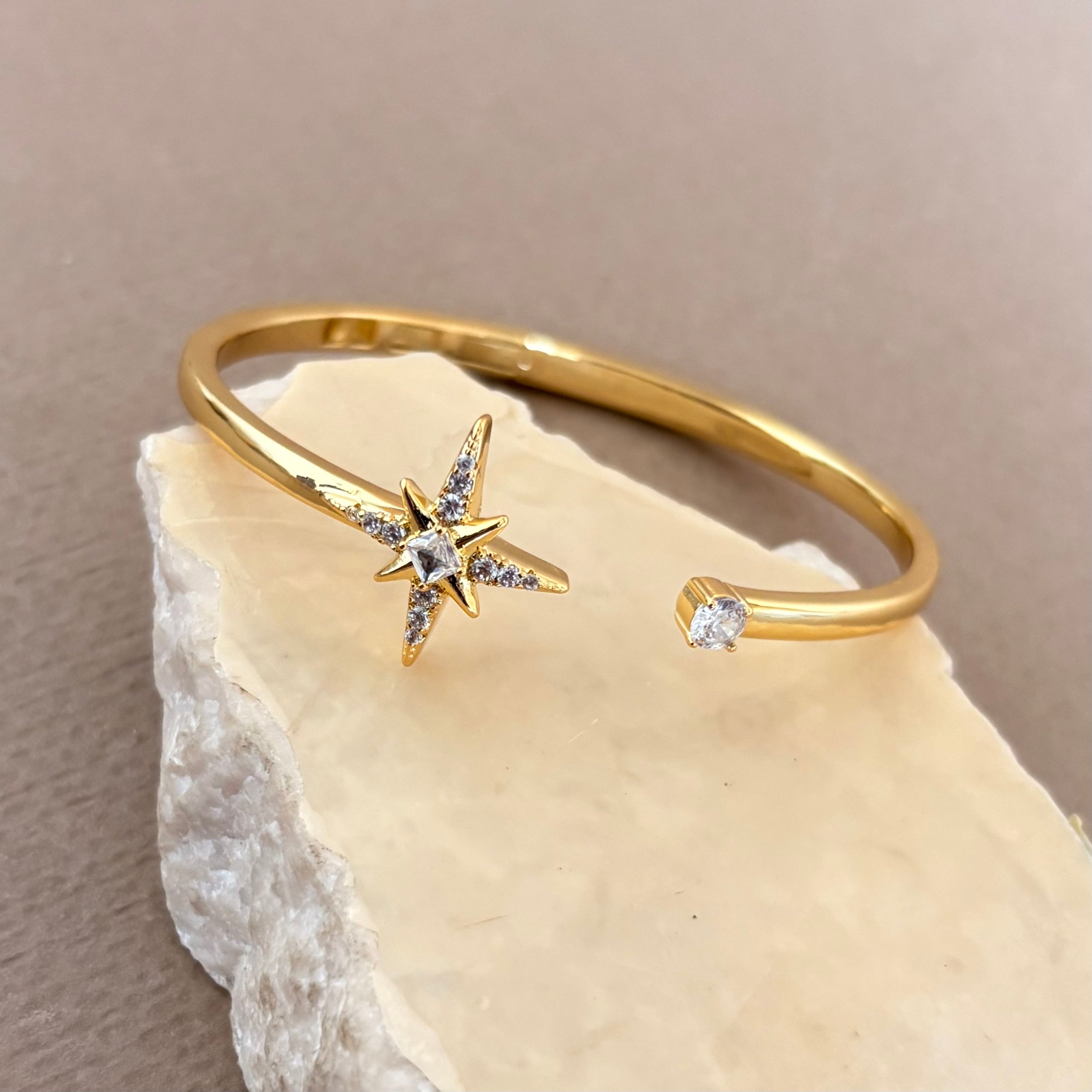 The Trezani gold plated bangle brings a celestial note to your wrist. A slim open cuff, polished to a gentle shine, ends with an eight-point starburst set with a princess-cut clear stone and fine pavé accents. The opposite tip holds a single square stone for a clean, modern finish. The look is delicate yet defined, made for those who appreciate detail.
