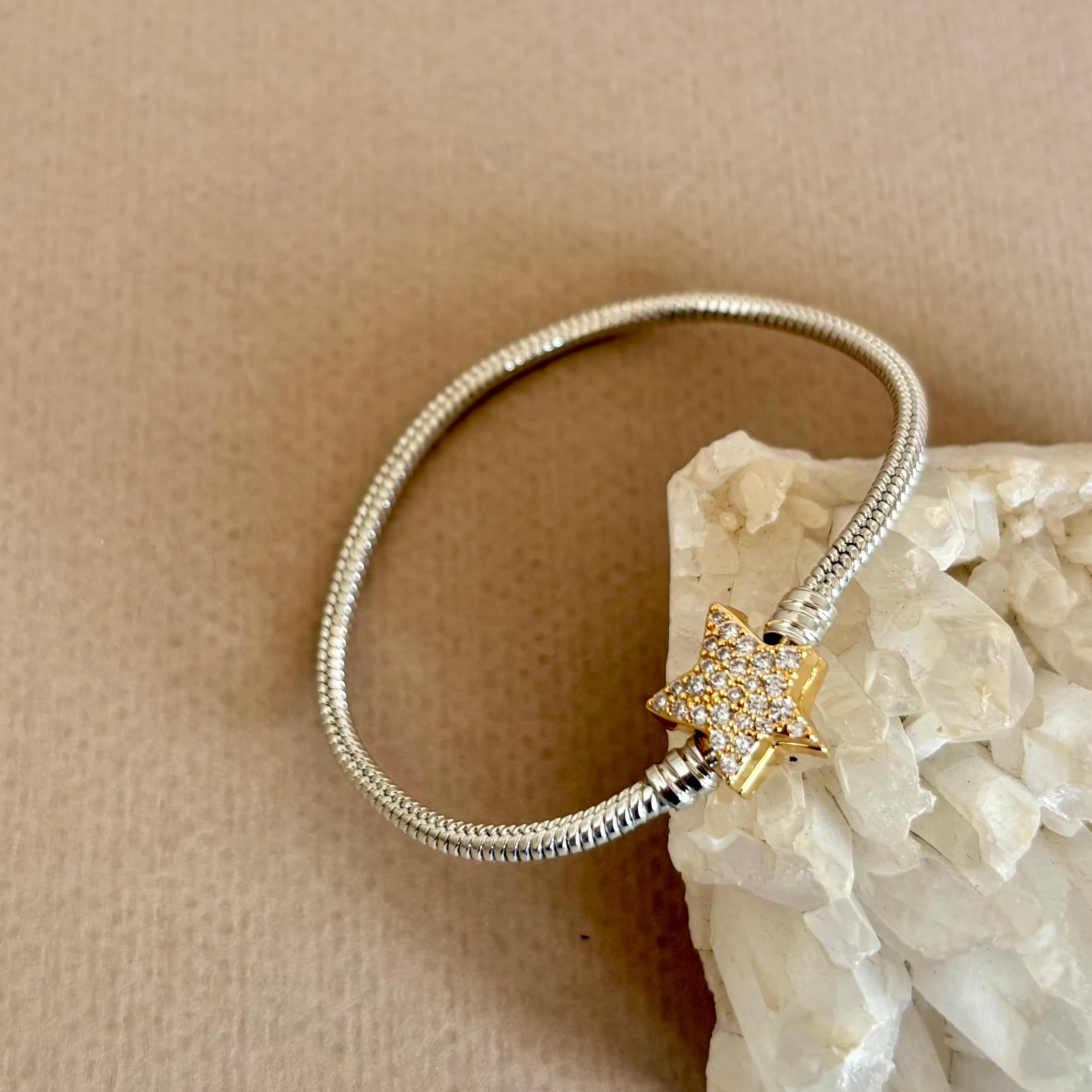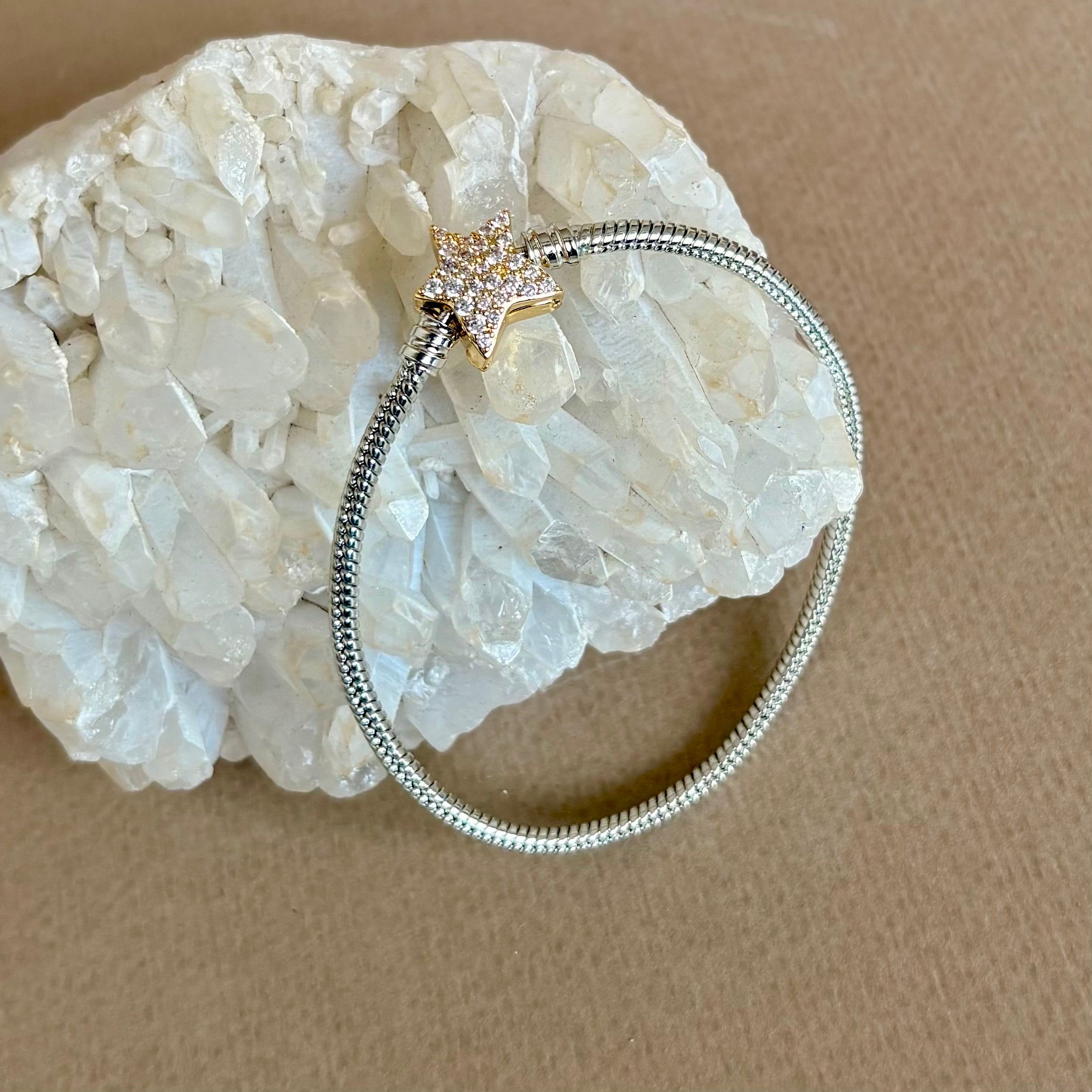 This white gold plated bracelet is light yet polished, with two ribbed accents that frame the star and add quiet texture. This two-tone bracelet wears beautifully solo or stacked for your own constellation. Make it yours today and add it to your collection.