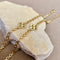 Selvar is a quietly striking gold plated bracelet crafted with slim square links and a polished two tone center bar. Five round stones rest in a cool silver tone setting, bringing refined sparkle while keeping the look clean and modern.