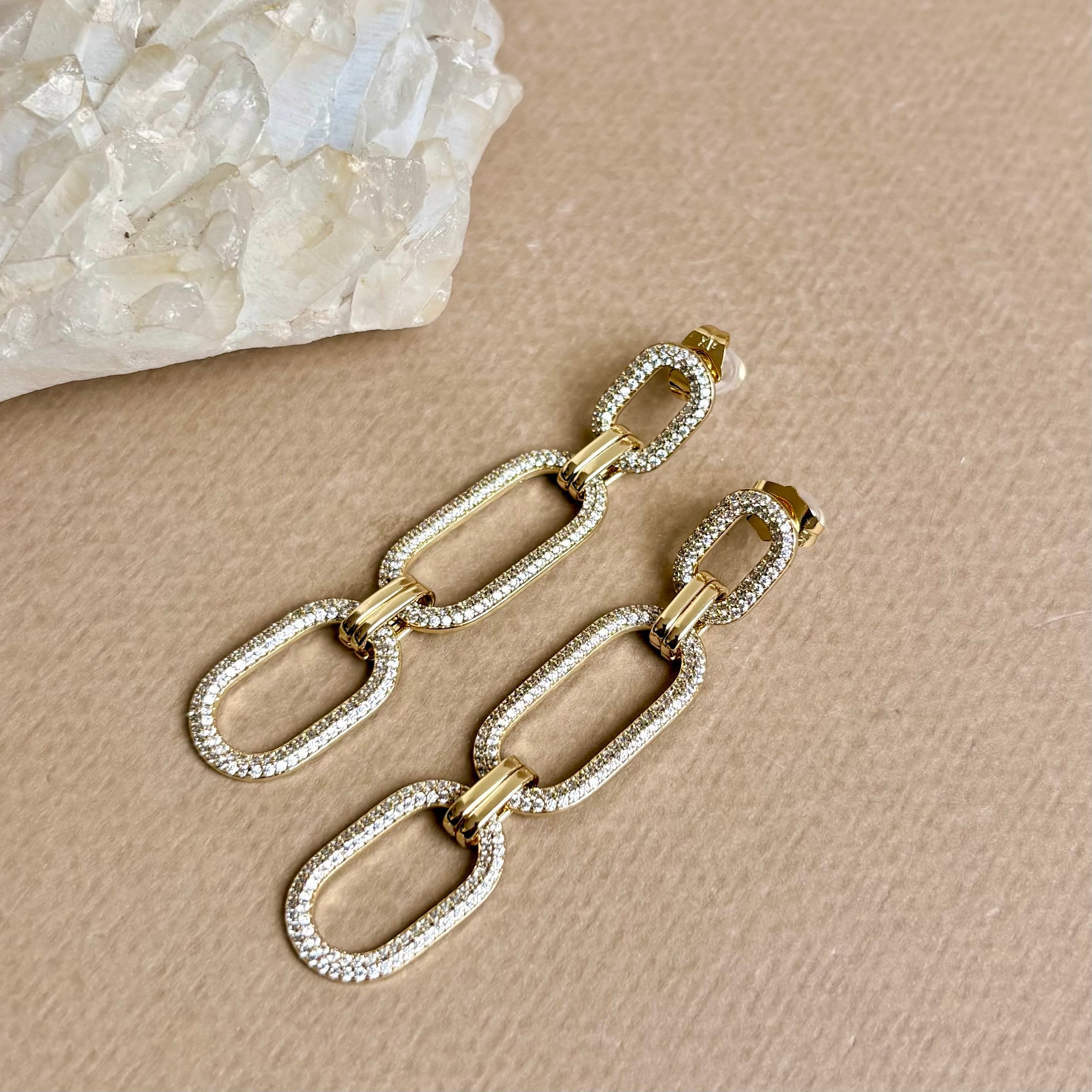 Corvix brings a refined edge to the chain-link look. Three open, elongated oval links are traced with pavé crystals and joined by polished connectors, creating a fluid drop that moves with you. The high-shine finish offers a bright, clean glow, while the open construction keeps the silhouette airy and comfortable for long wear.
