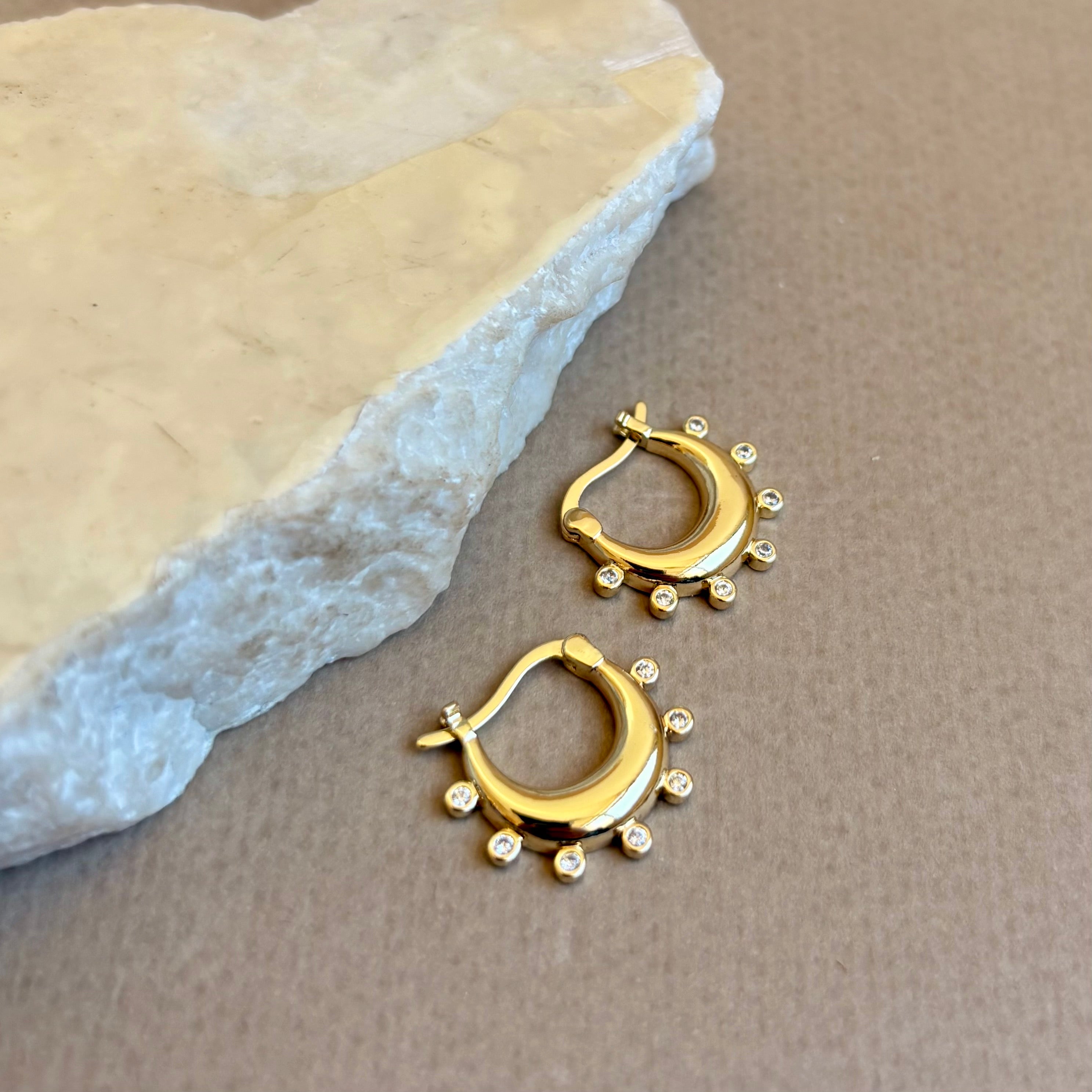 Kavrin brings a clean, luminous finish to your look. These huggie hoops are plated in warm gold and traced with petite bezel-set clear stones, forming a subtle crown silhouette. Polished edges frame each stone for smooth wear. The smooth, high-polish body feels substantial yet easy, a quiet touch that makes the everyday feel special.