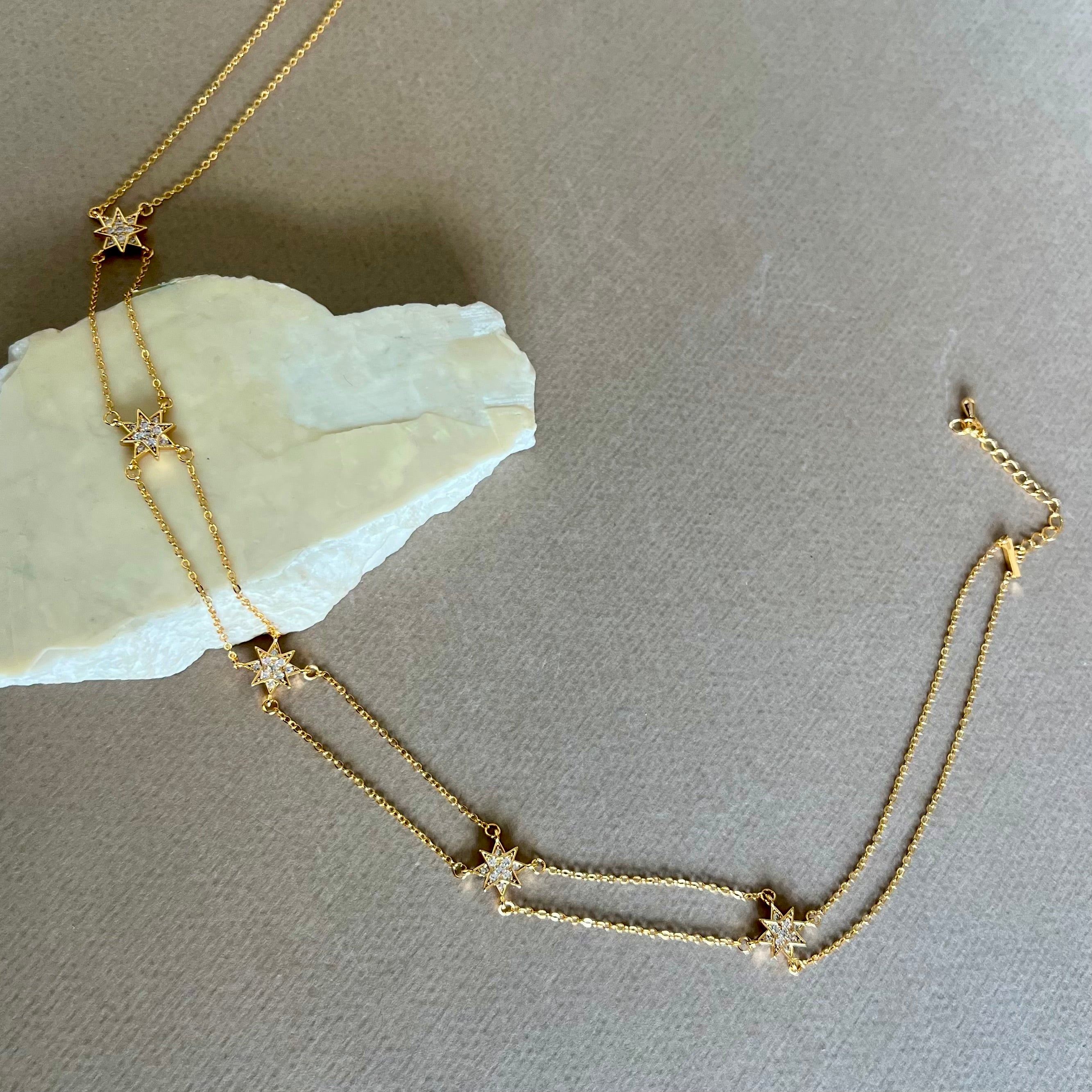 Auralis is a gold plated necklace designed as a refined choker. Two delicate cable chains hold three starburst stations, each finished with pavé-set clear stones for a gentle, celestial shimmer. The double strand sits gracefully at the collarbone, offering a layered look in one piece.