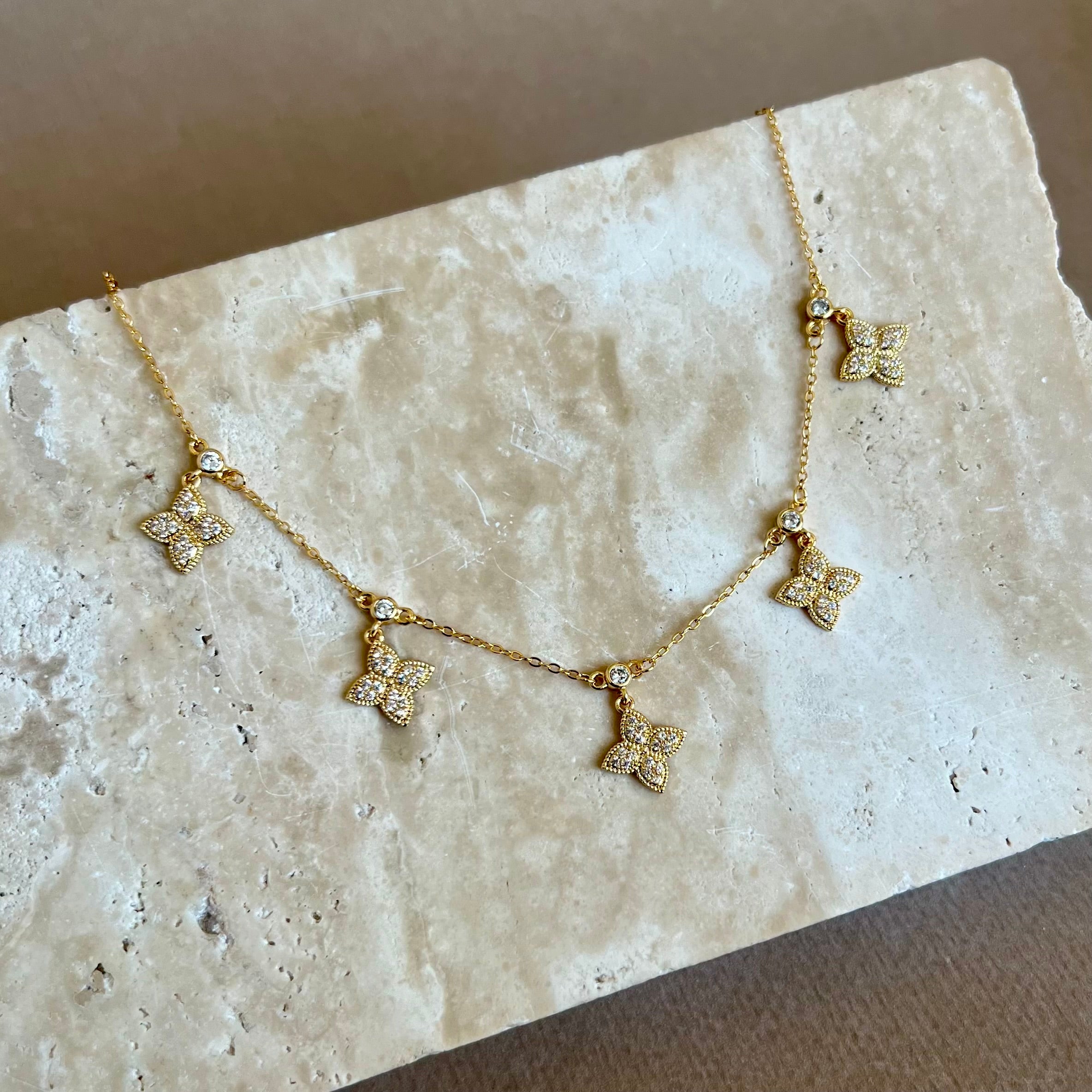 The Rosan 02 gold plated necklace brings a quiet glow to every look. Five petite quatrefoil charms, pavé with clear stones and edged in fine milgrain, drift along a refined cable chain. Between them, bezel-set accents lend a soft shimmer that feels graceful from day to night.