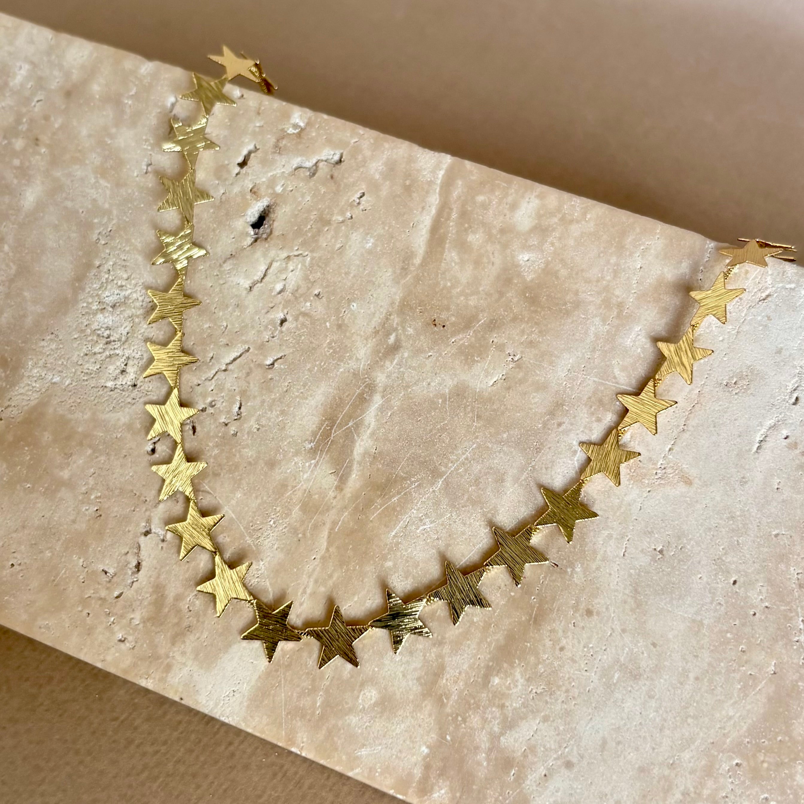Starz frames the neckline with a trail of brushed stars, each link softly textured for a gentle satin glow. The flat, five-pointed motifs lie smoothly along the collarbone, creating a fluid line that moves with you. Supple links curve naturally for a comfortable fit. Polished edges and a refined clasp complete a clean, modern profile.