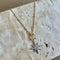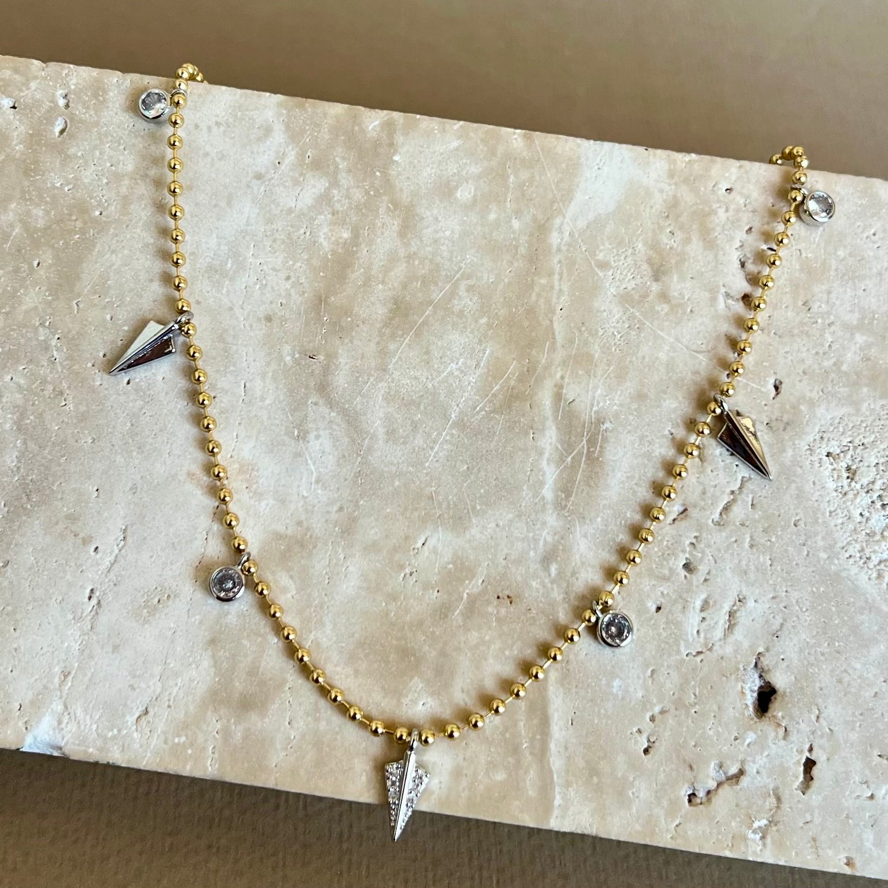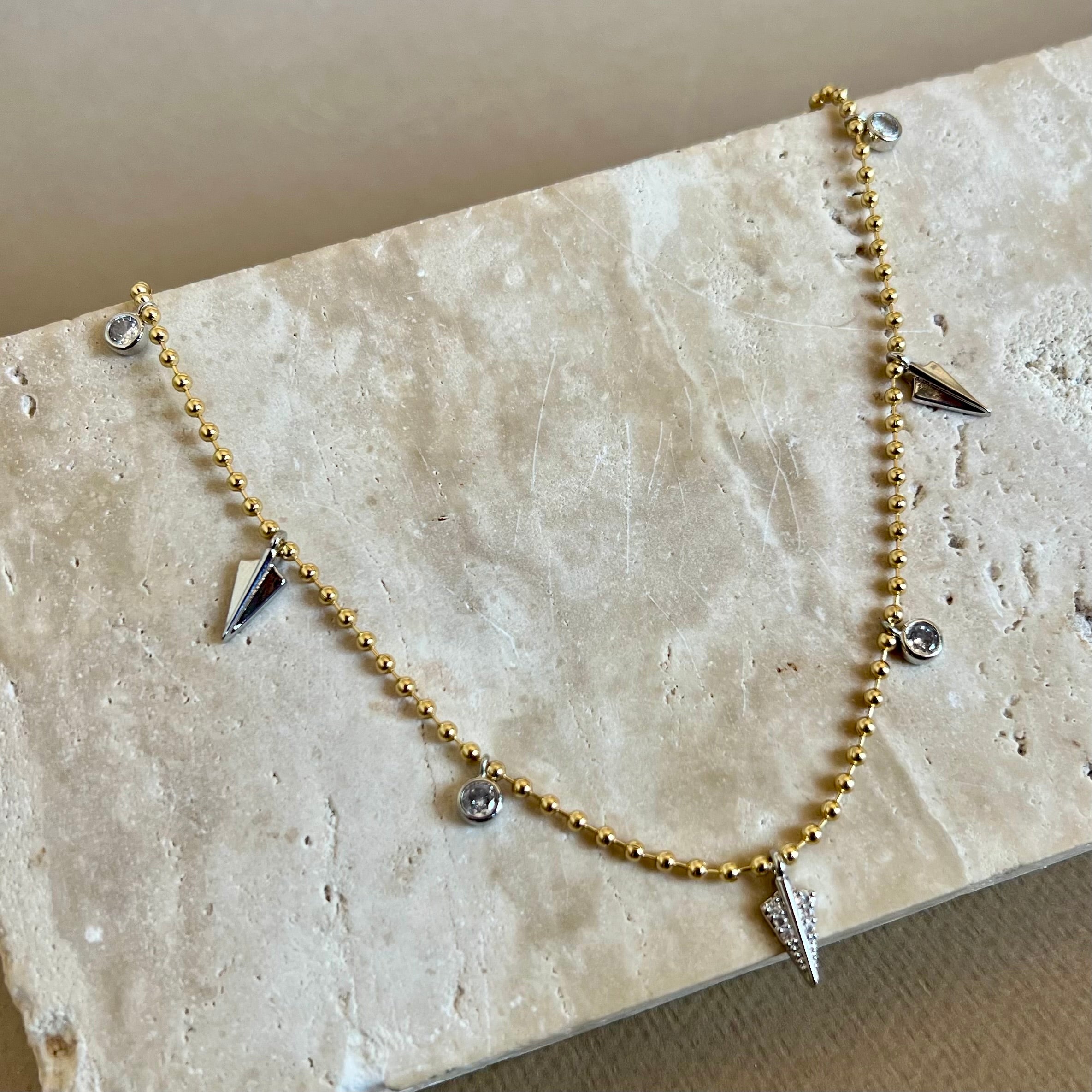 Tirena brings a fresh take on classic shine. A delicate beaded chain in warm gold is set with four round bezel crystals, spaced between three arrowhead charms. The center spike is pavé for a hint of brilliance, while the two polished spikes add clean contrast and a sleek, modern mood.