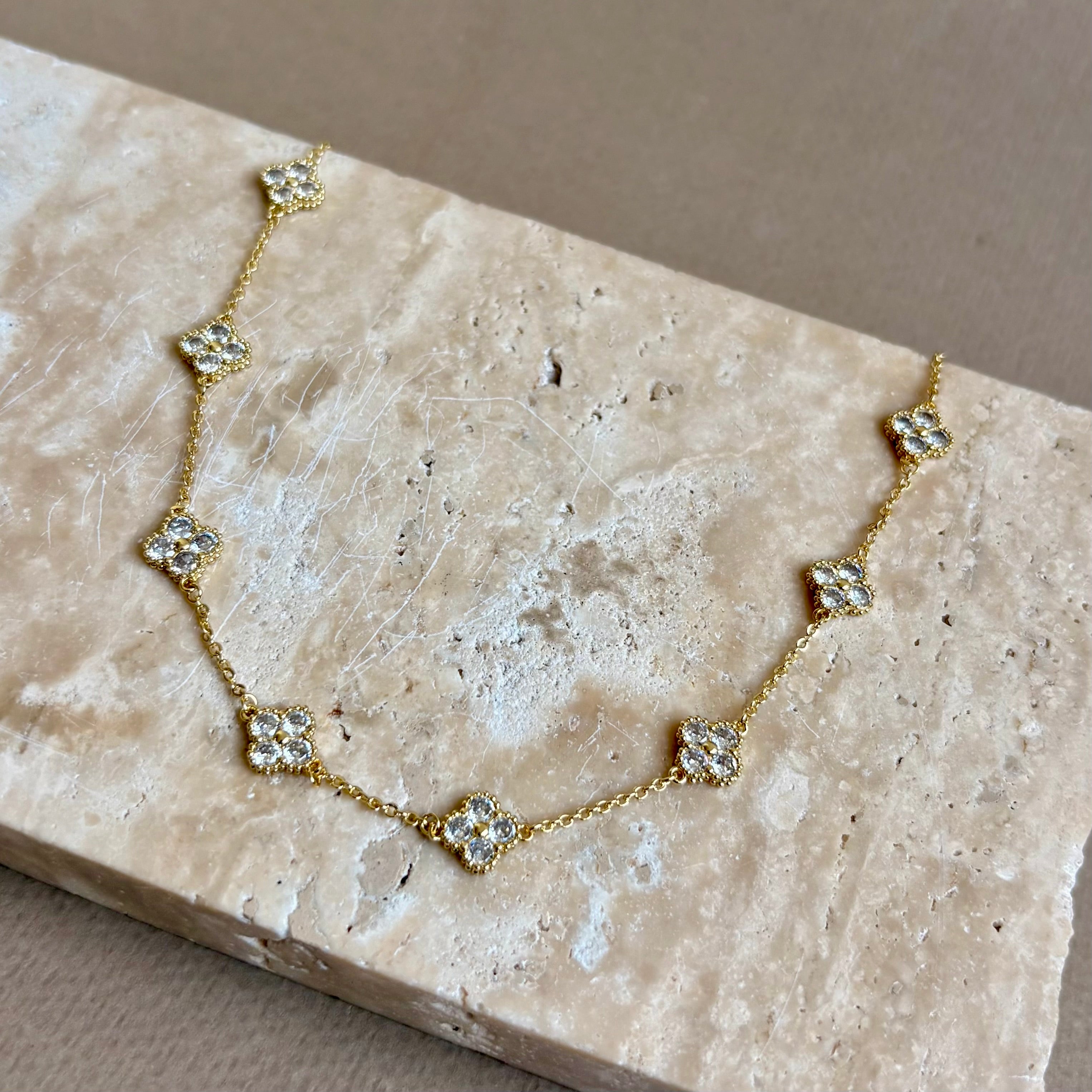 Zantra 03 brings a quiet glow to every moment. This gold plated necklace features a fine cable chain set with petite quatrefoil stations. Each rounded square motif is framed with delicate milgrain and lit by clear stones in a soft floral pattern, offering refined sparkle that feels effortless from day to night.