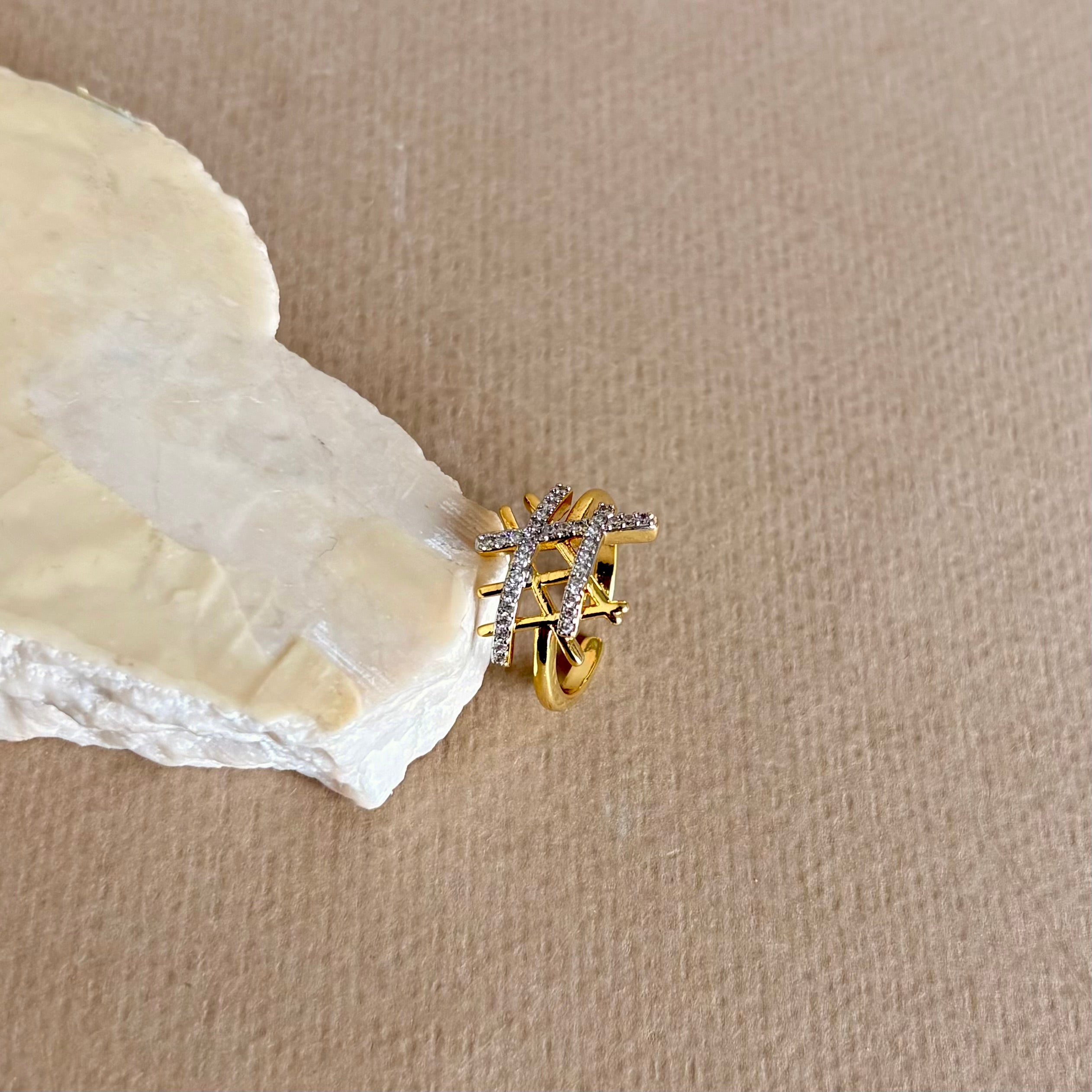 The Selvion gold plated ring offers a clean, sculptural profile. A double-band cuff is joined by slim crossbars to create a refined criss cross lattice. Two pavé-set rows add bright sparkle, balanced by a high-polish golden finish. The open band sits light on the finger.