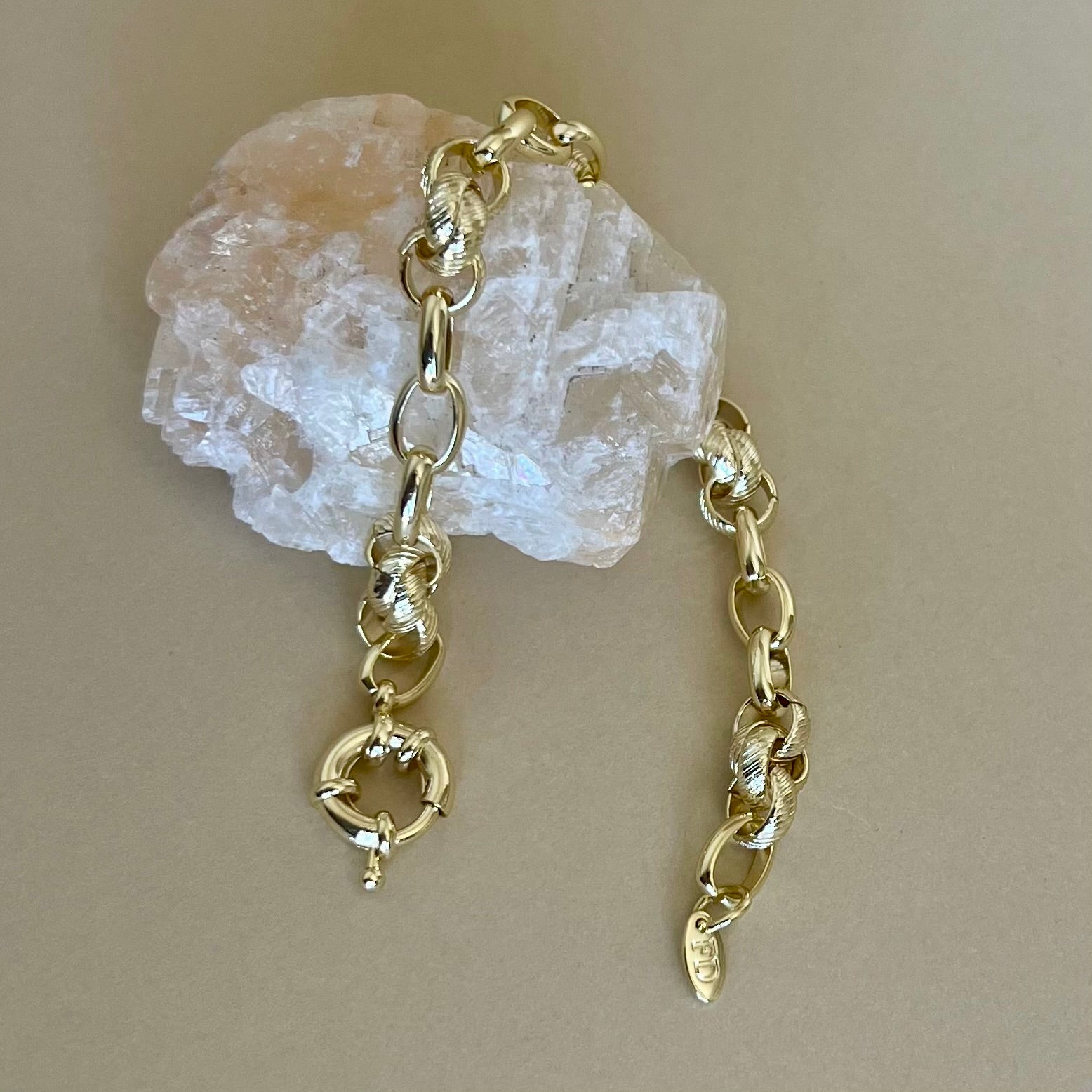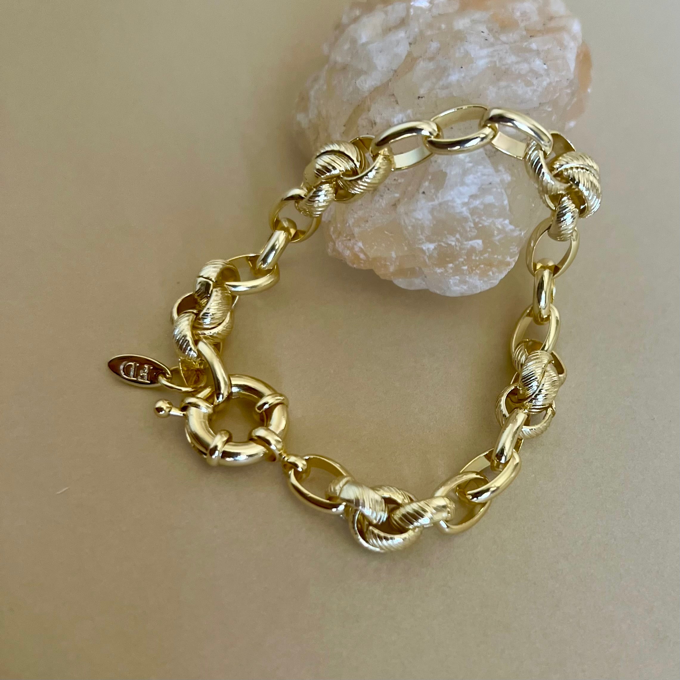 Aurson brings modern polish to a timeless chain. This gold plated bracelet pairs smooth oval links with rope-textured knots for rich detail and a quiet glow. The silhouette feels substantial, yet refined, with a high-shine finish that frames the wrist with warmth. A graceful ring clasp and petite tag finish the piece with a clean touch.