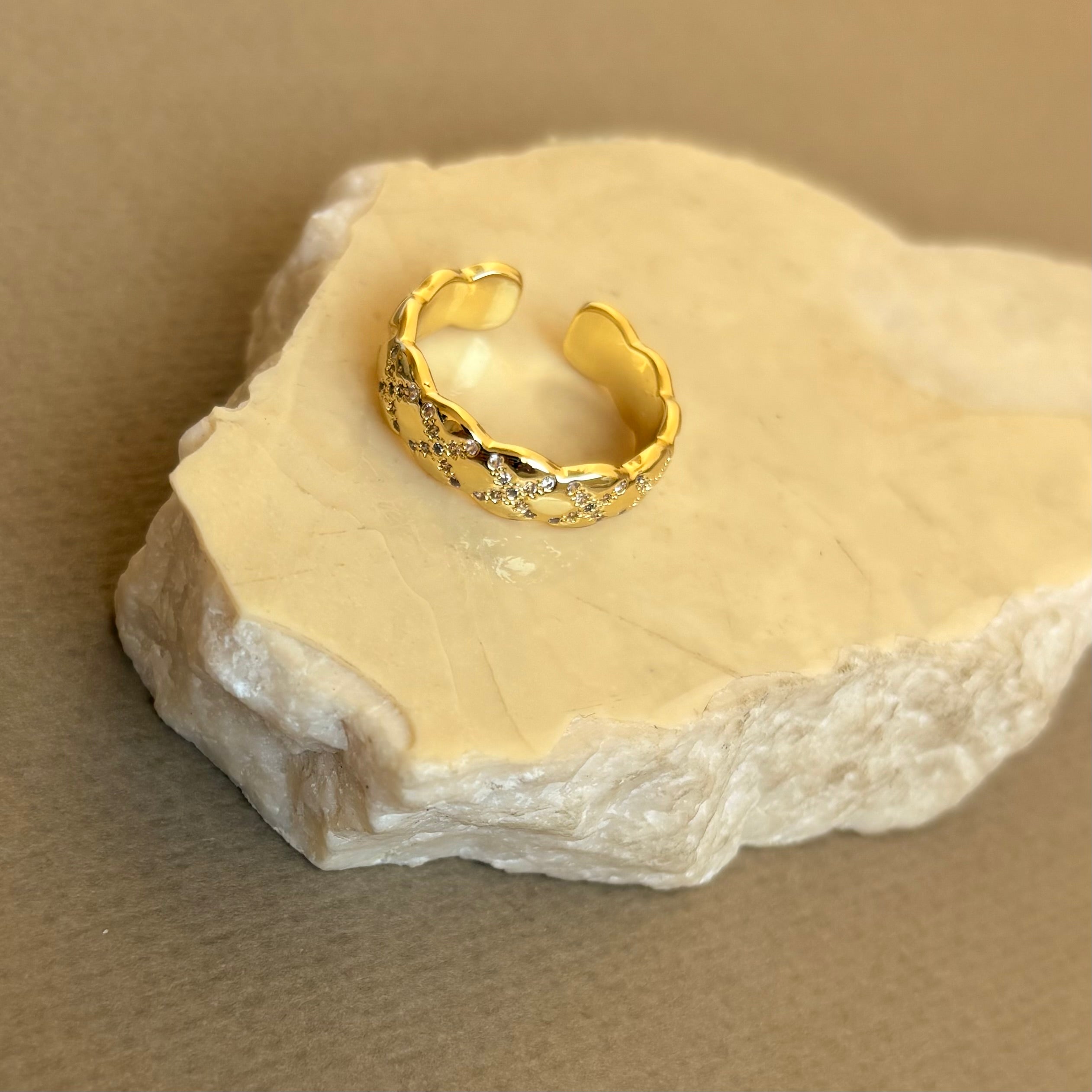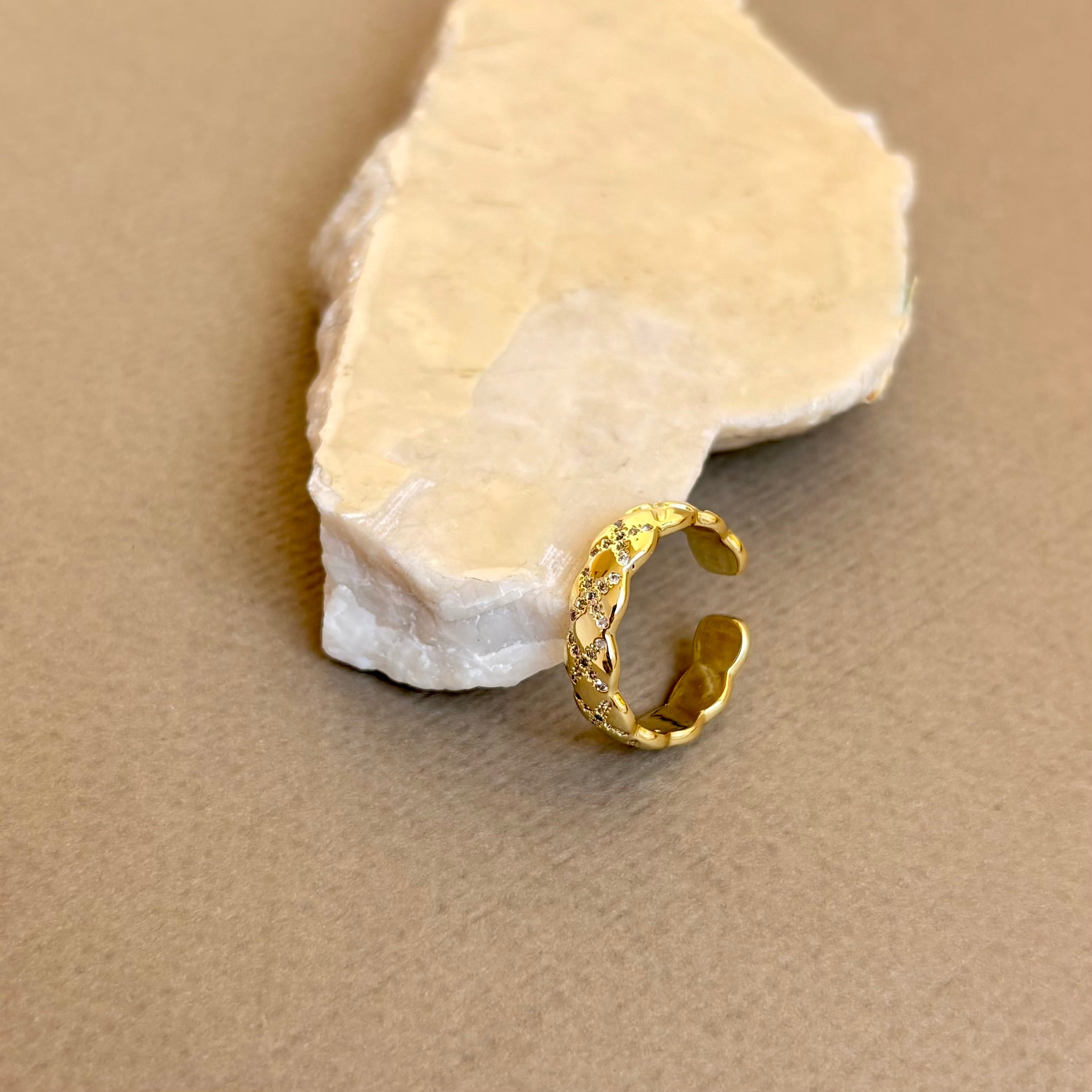 Belvin brings quiet shine to every day. This gold plated ring features a wide, open cuff silhouette traced with a braided chain motif. Pavé-set clear stones add a gentle shimmer, while softly scalloped edges and a mirror-polished finish keep the look refined. Thoughtful craftsmanship and a smooth inner band make it as comfortable as it is striking.