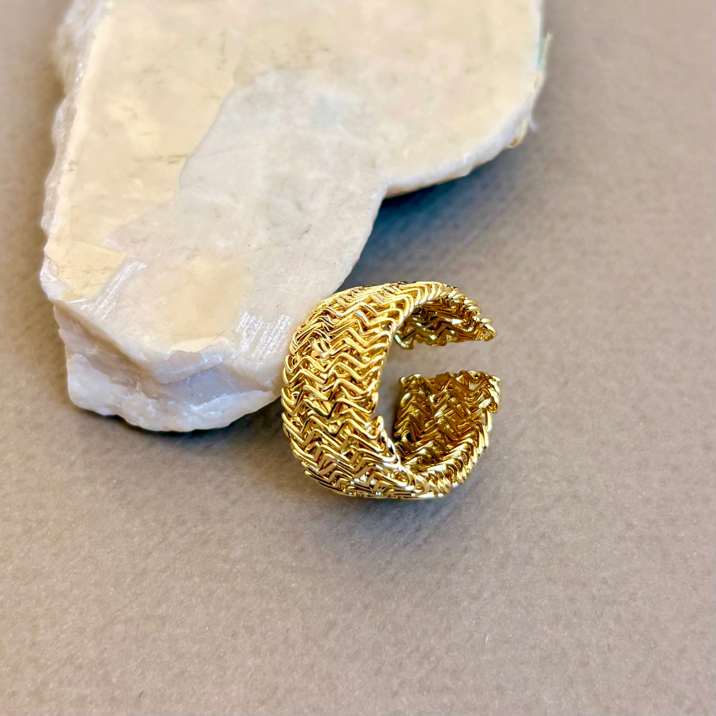 Bravira is a bold, sculptural band for days when you want your style to feel intentional. Its wide profile is carved with a dense chevron texture, creating a refined play of shine across every ridge. Finished in high-polish yellow gold plating, the ring features a smooth interior that rests comfortably against the hand.