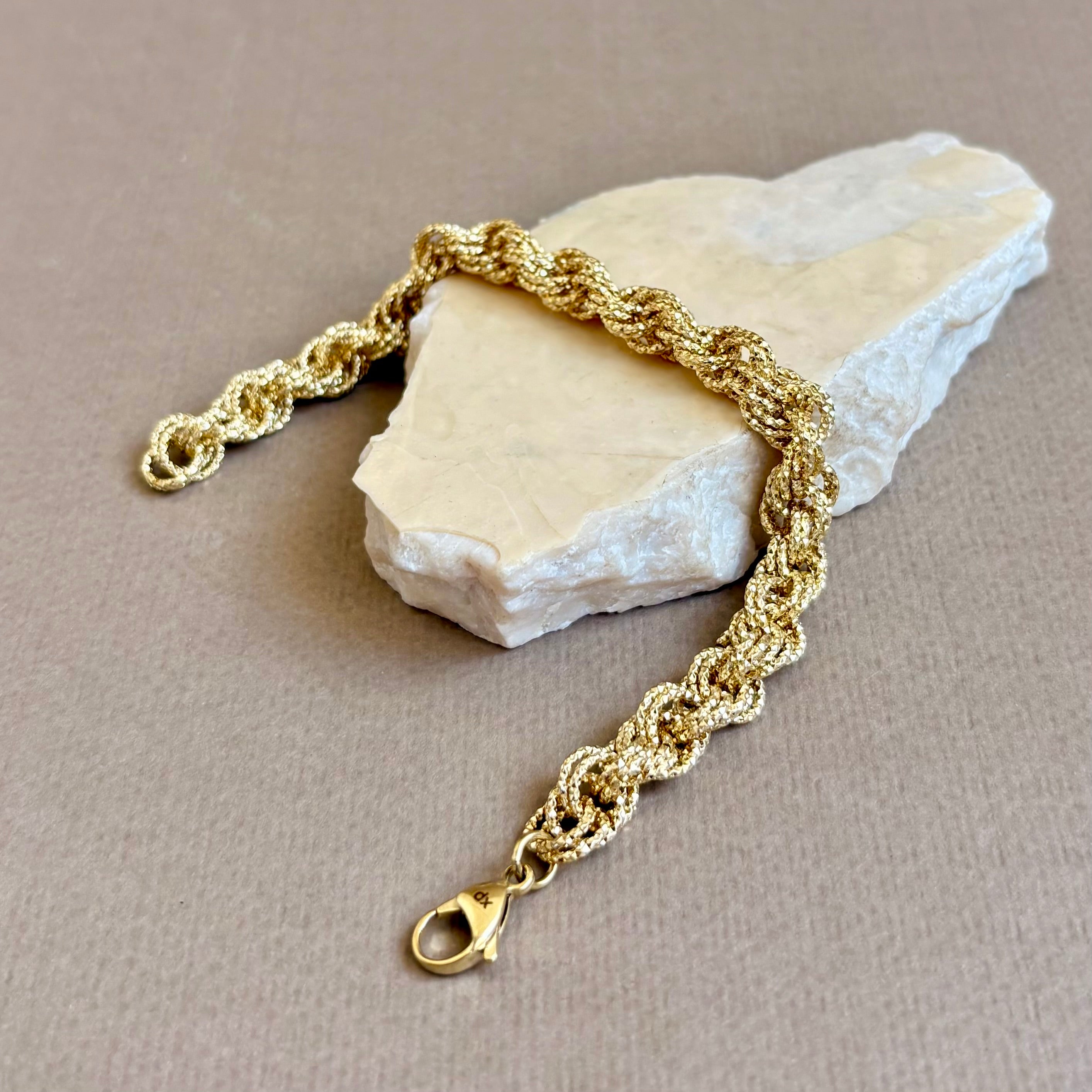 Briellea is a gold plated bracelet shaped in a sculpted rope chain, tightly woven for a refined, tactile feel. The braided links create crisp texture and a warm, polished glow, finished with a secure lobster clasp. Its bright yellow-gold tone brings instant polish to any look.