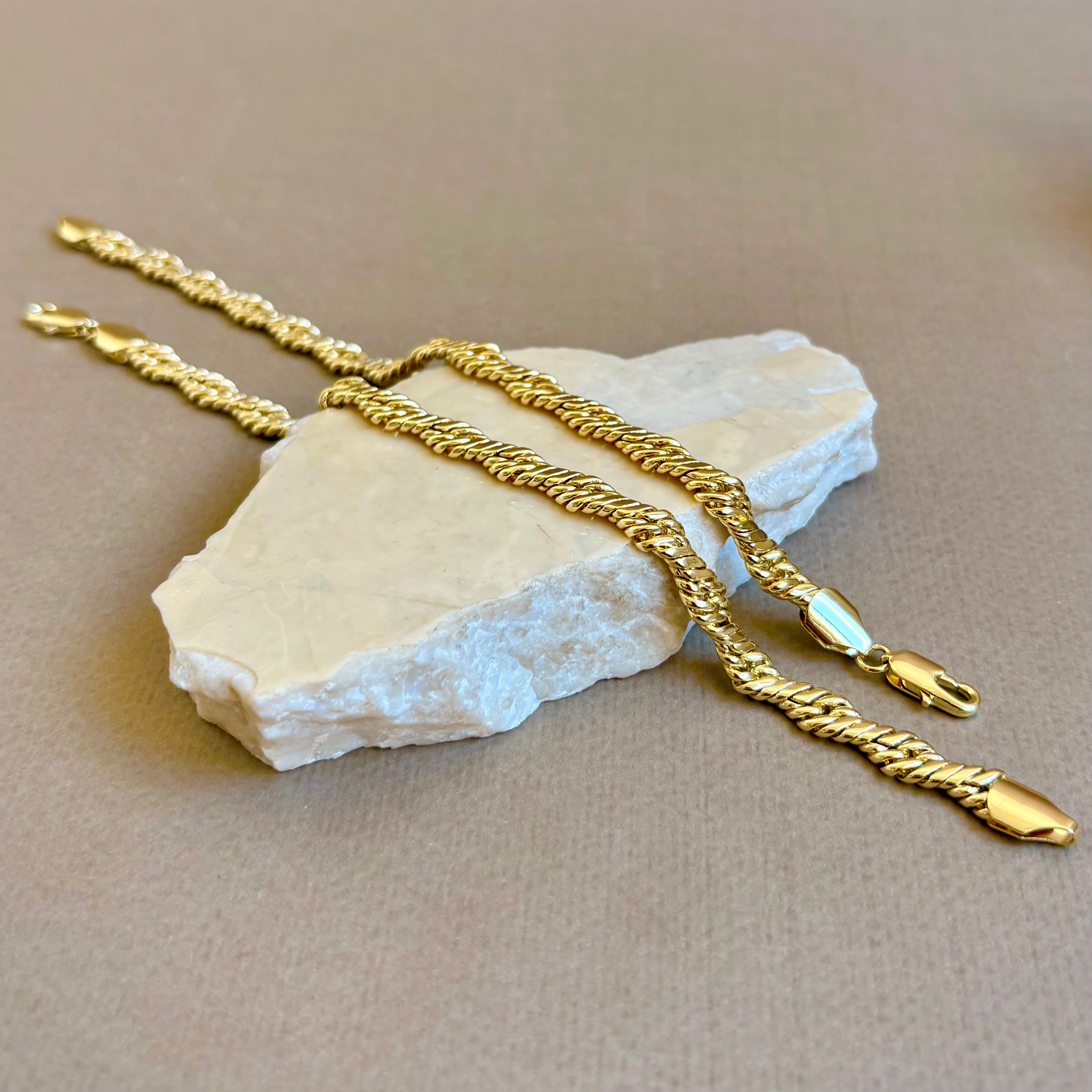 Calnero is a study in quiet luxury. This gold plated bracelet features a polished rope chain with a supple weave that lends depth and shine. Sleek tapered end caps and a secure lobster clasp complete its refined profile. Each detail is considered for lasting comfort and easy wear.