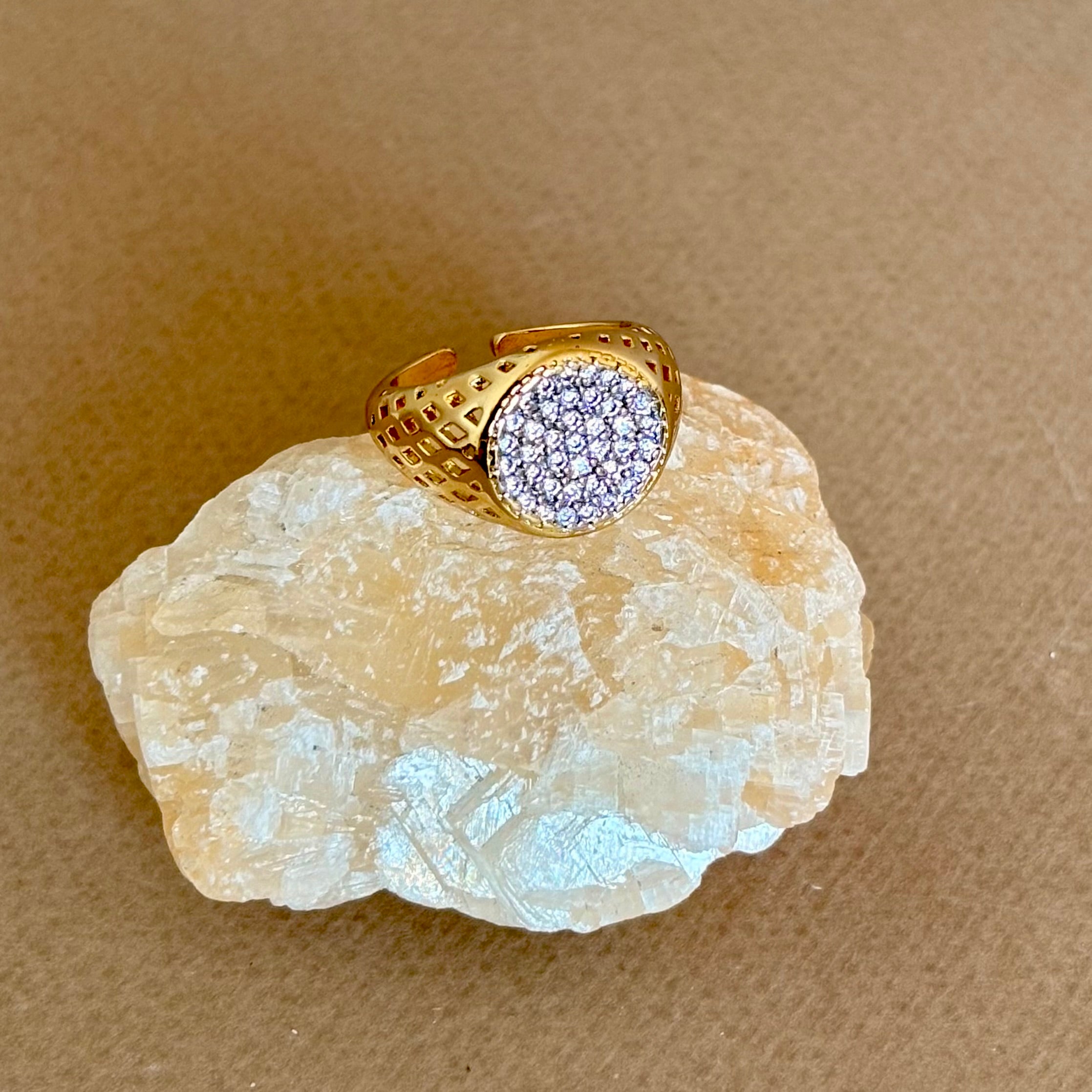 Corah is a modern take on the signet, crafted as a gold plated ring with a luminous pavé disc. The round top glows with fine stones, set on a sculpted band that tapers for comfort. Diamond-shaped cutouts along the shoulders bring lightness and detail, while the polished finish gives a smooth, refined look.