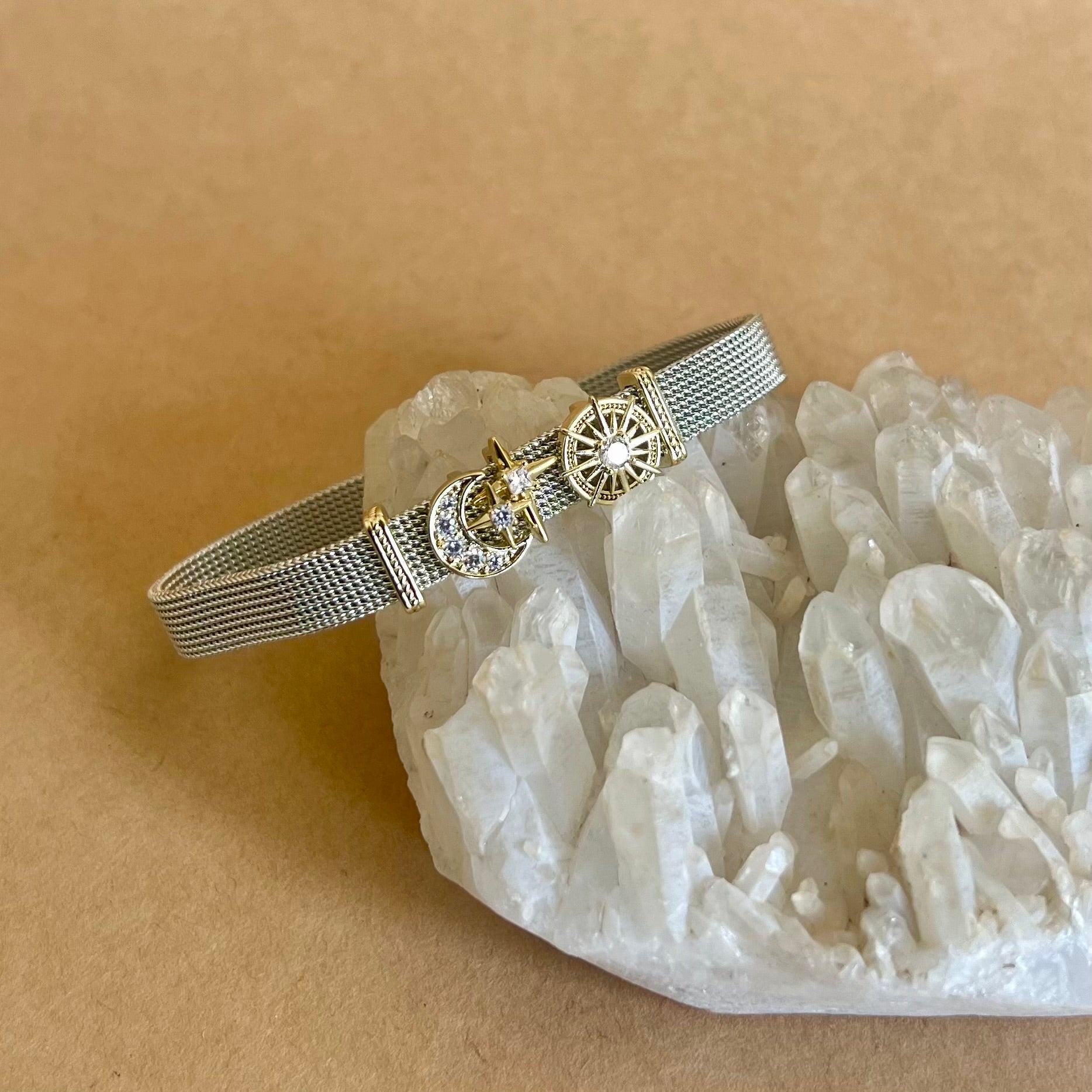 A hint of stardust for your wrist. The Diva 05 gold plated bracelet pairs a fine silver mesh strap with luminous gold-plated charms: a pavé moon, a bright star, and a sunburst compass set with clear crystals. It catches light with every move, adding quiet sparkle to your day.