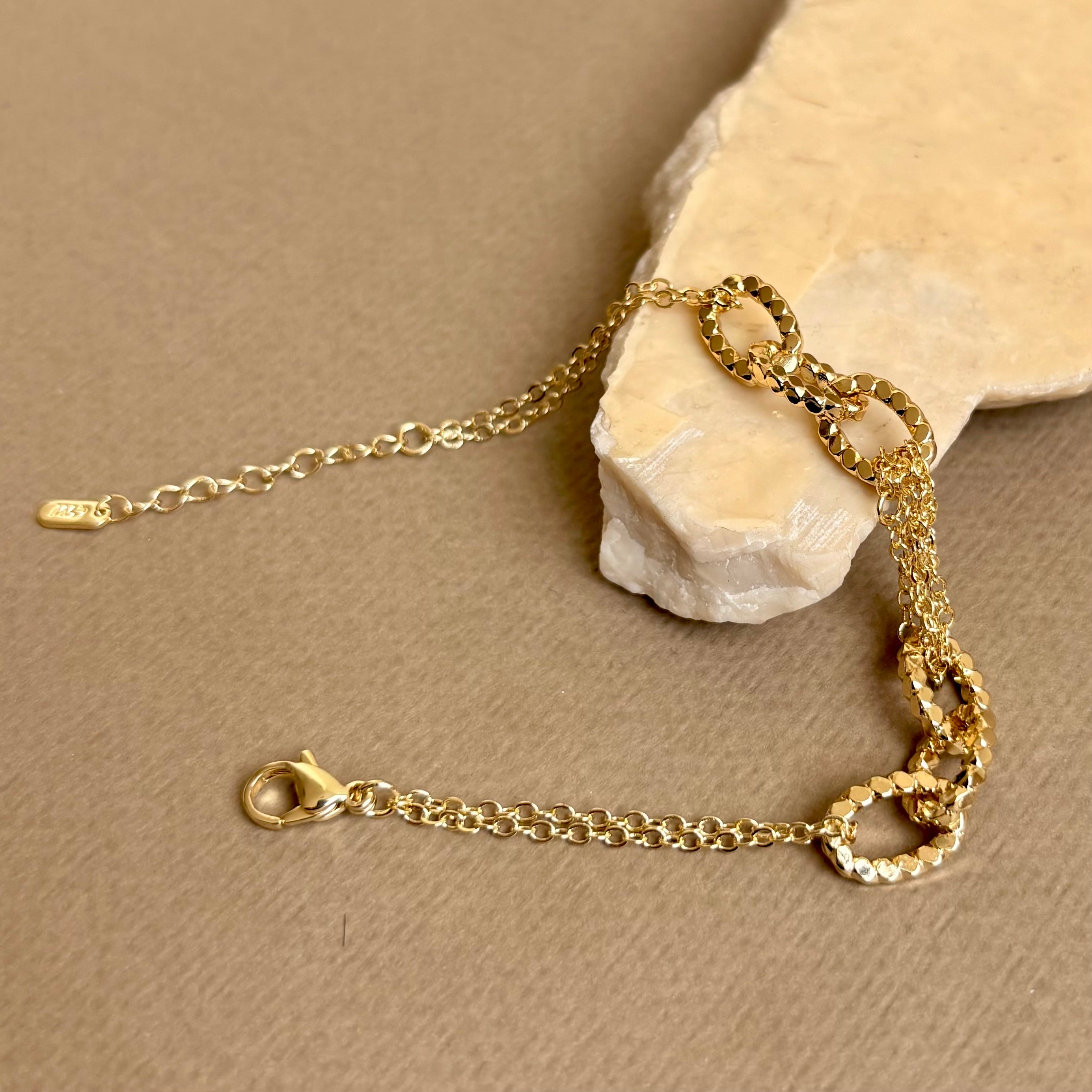 Dorvielle brings a refined gleam to every day. This gold plated bracelet centers on three sculpted oval links with a gently hammered texture, framed by delicate double cable chains. A petite cascade of fine strands drapes between the links, adding soft movement and dimension. The high-polish finish keeps the look fresh and timeless.