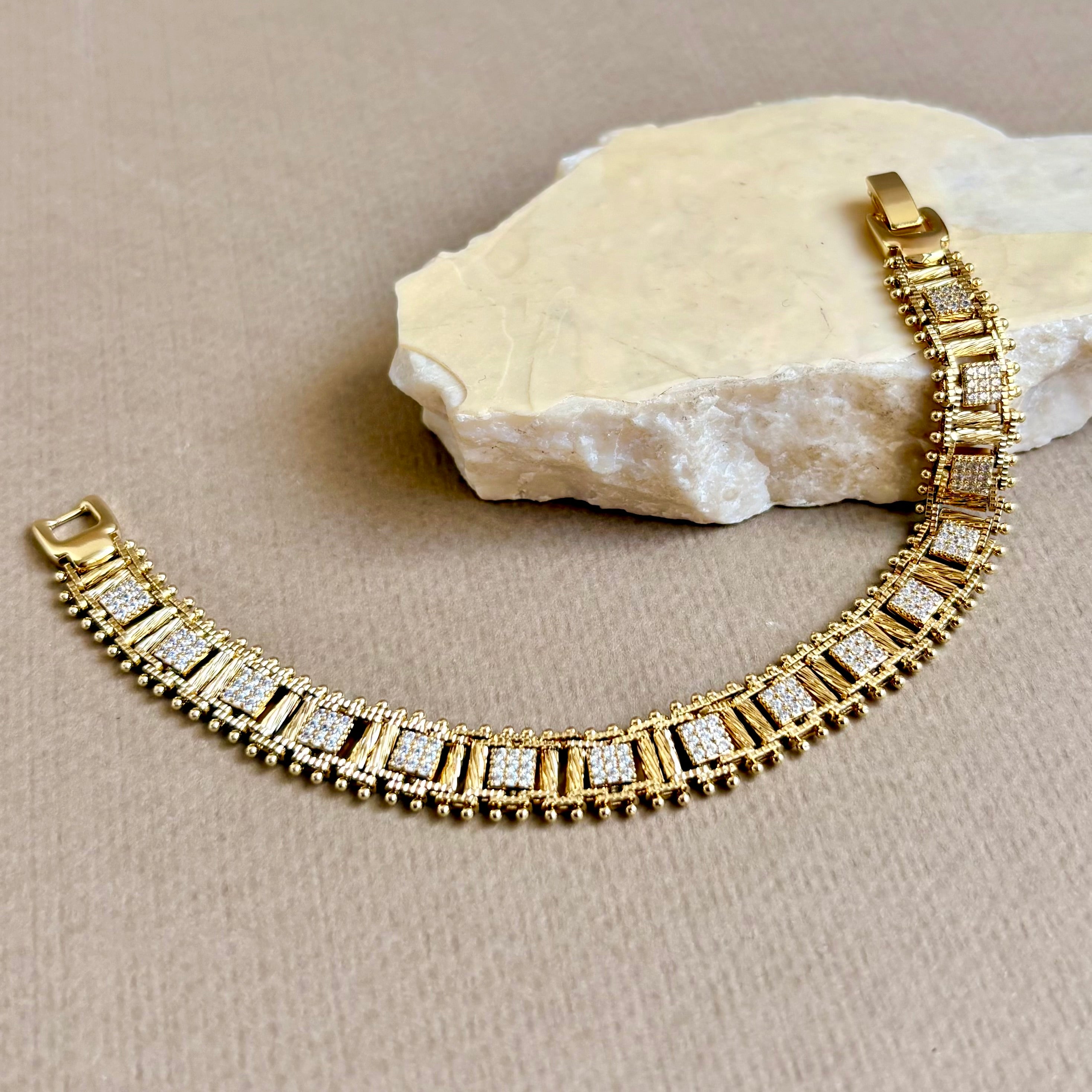 Isvane presents a gold plated bracelet that balances clean geometry with quiet sparkle. Rectangular links with fine ridges alternate with pavé-set square panels, each edged in delicate beading. The result is warm, polished and beautifully refined. A high-polish finish complements both everyday looks and evening wear.