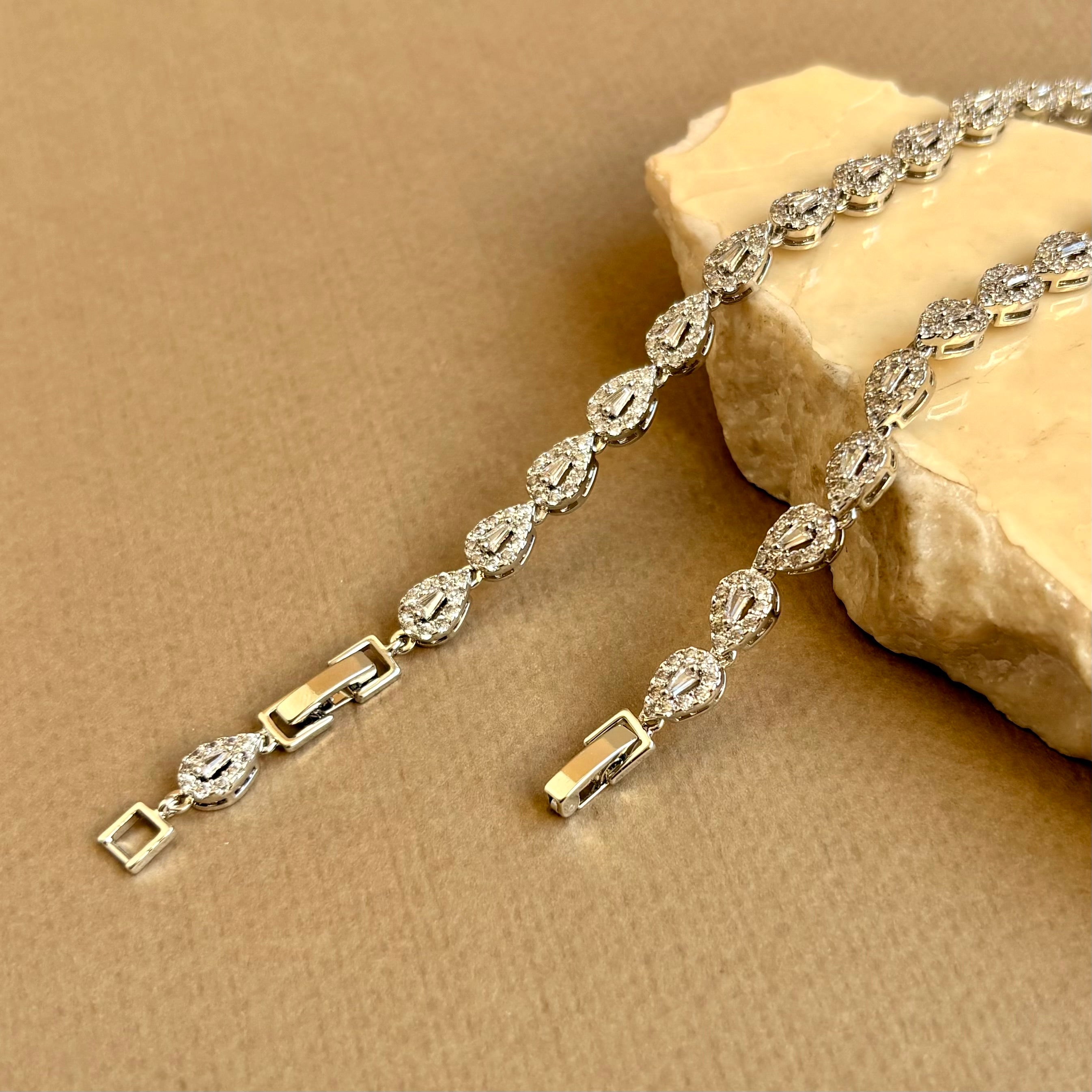 Jorelia brings graceful shine in a refined design. This gold plated bracelet is finished in white gold plating with pear-shaped links. Each link centers a clear pear-cut stone framed by a delicate halo of pavé accents, offering brilliant sparkle with a polished, modern feel. A high polish mirrors the stones for a clean, refined look.