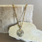 Orella is a gold-tone stainless steel necklace with a clean, geometric glow. Its open medallion pendant layers three concentric pavé circles around a sleek vertical bar, catching light from every angle. A rectangular pavé bail links the pendant to a polished, medium-link chain for a balanced, modern look.