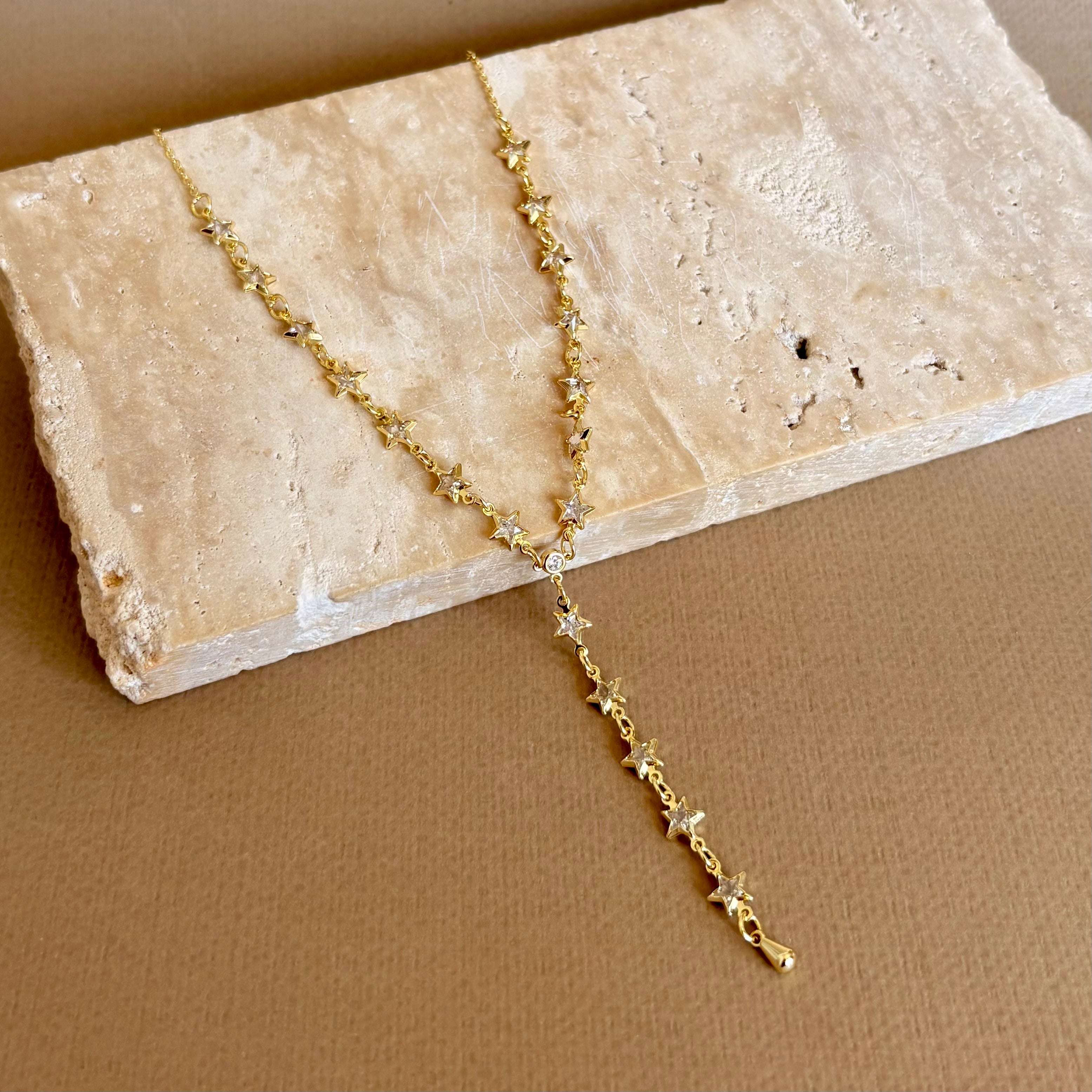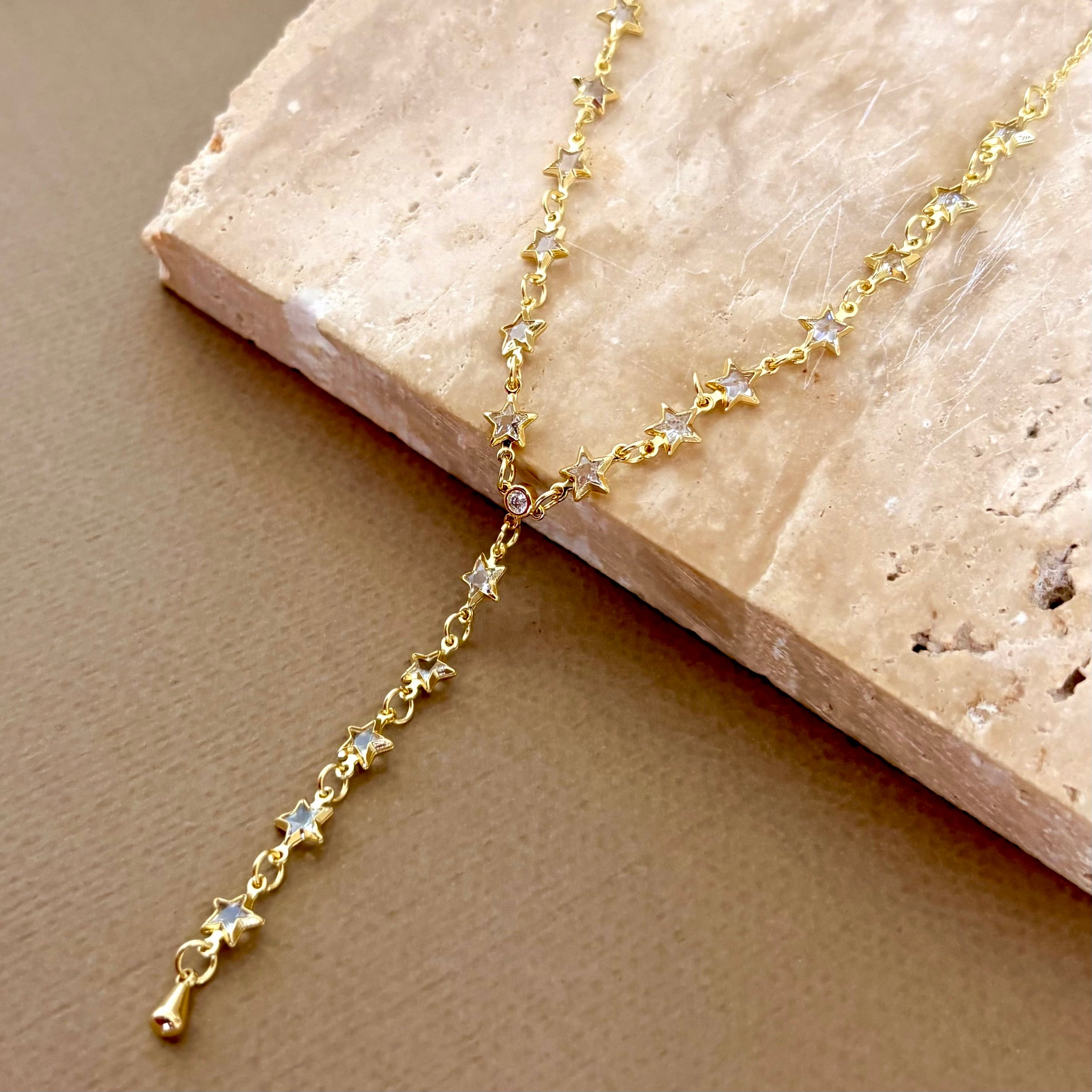 Shatra is a gold plated necklace shaped as a slender lariat. A line of polished star links glows with soft white inlays, some kissed with a clear sparkle. At the center, a bezel-set stone marks the Y, leading to a delicate teardrop charm. The look is celestial and graceful, made for moments that call for quiet shine.