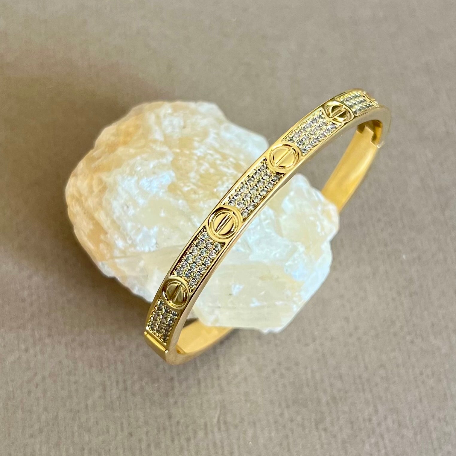 The One | Gold Plated Bangle brings quiet shine with a modern edge. A polished gold tone frames a central panel of micro pavé clear stones, set between evenly spaced circular stud motifs. Its slim, oval shape sits comfortably on the wrist and works with everything from a white tee to a little black dress.
