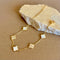 Virelia frames your wrist with quiet polish. A fine cable chain holds five petite clover stations, alternating glossy white inlay with textured, beaded gold. Each motif is edged for subtle dimension, and a secure lobster clasp with extender lets you find a comfortable fit.